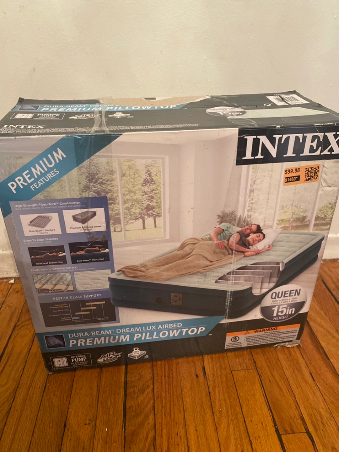 Queen size air mattress, includes internal pump. Has a pillowtop and is 15 inches high.