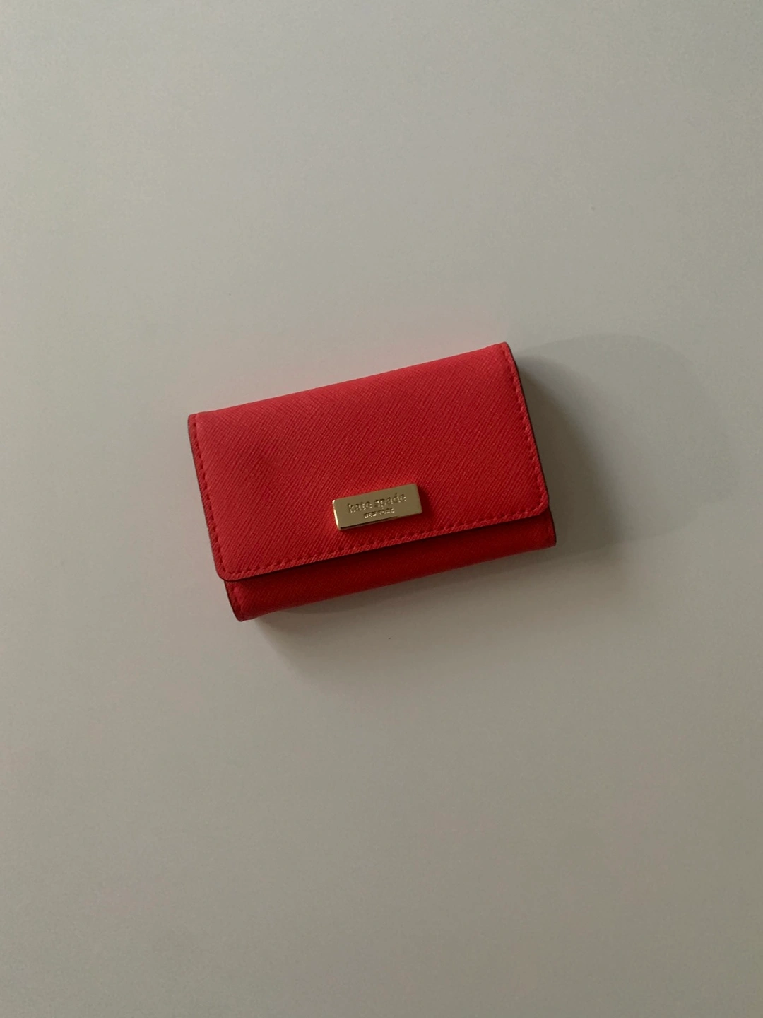 322Red key chain with a key ring inside. Folds in half and is made of leather.
