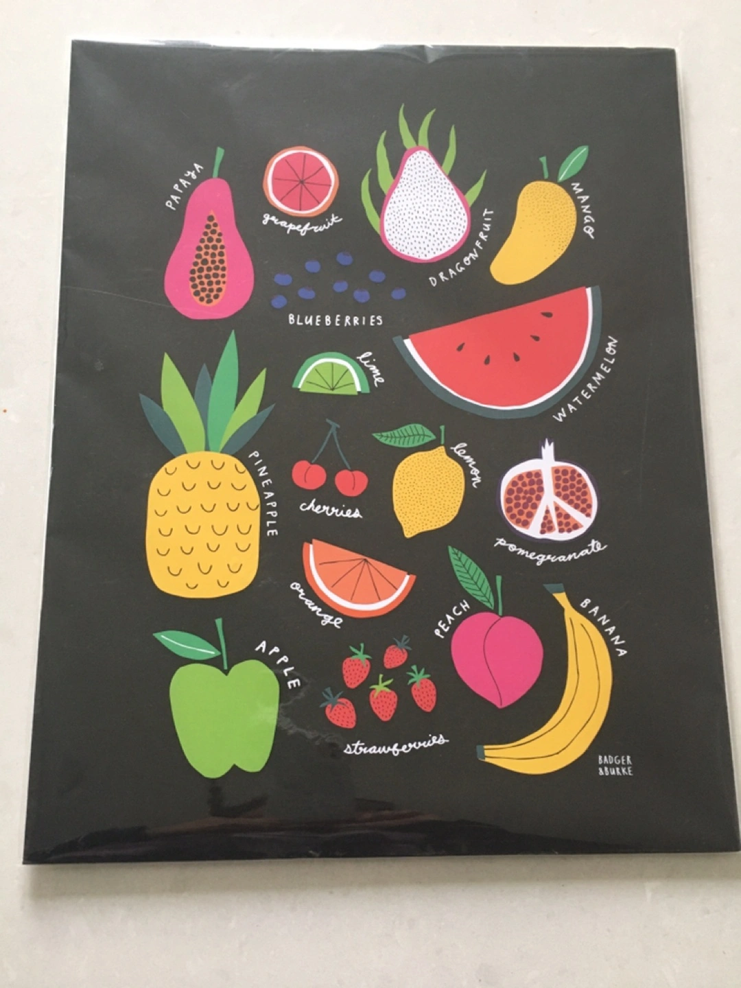 Art print featuring a colourful illustration of various fruits. Measures 11" x 14".