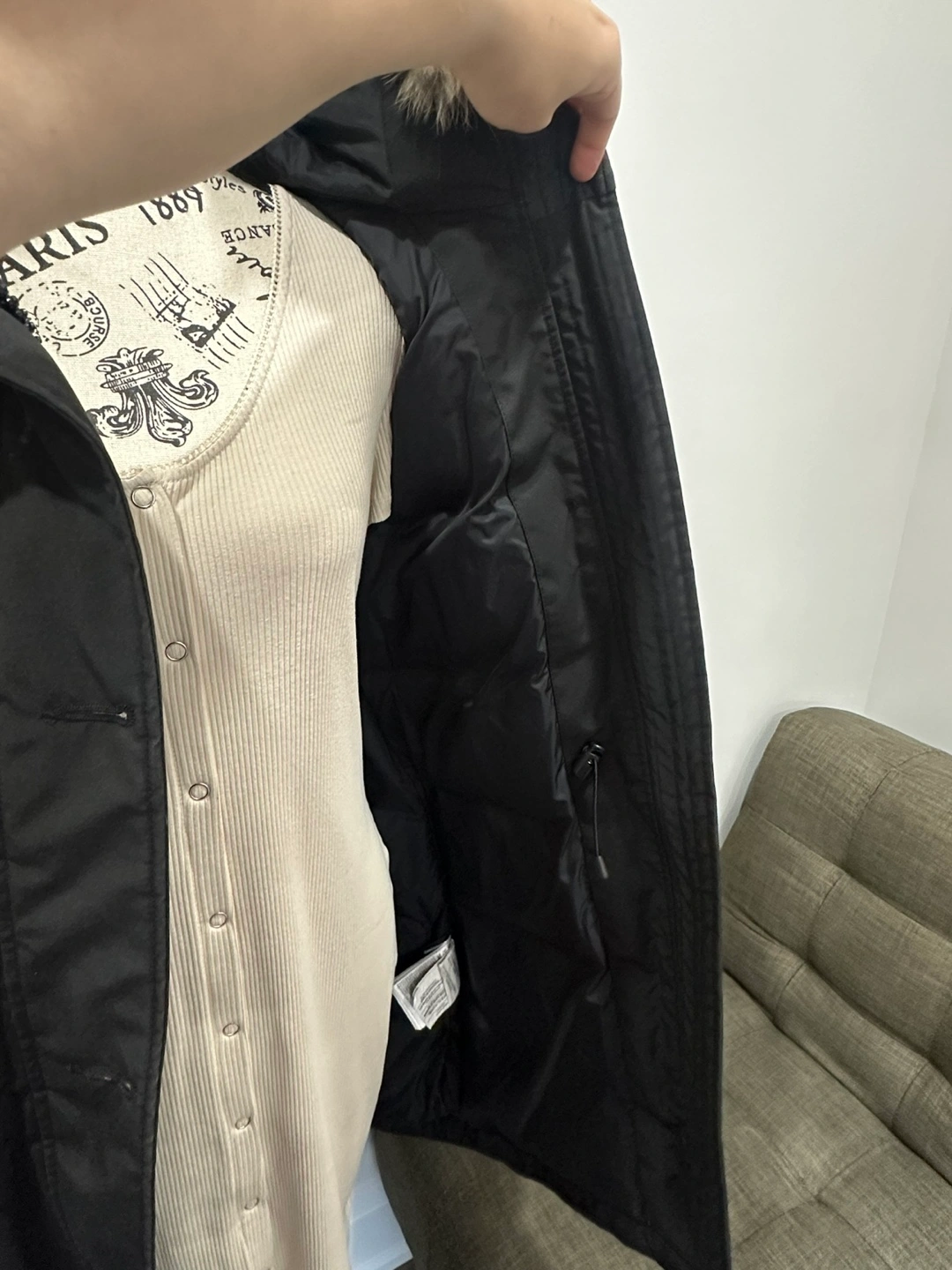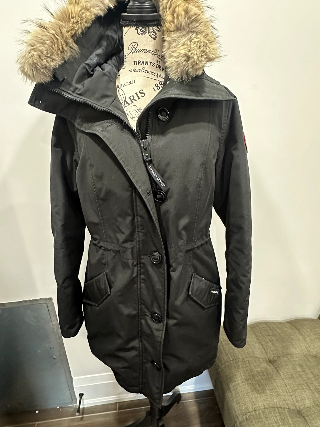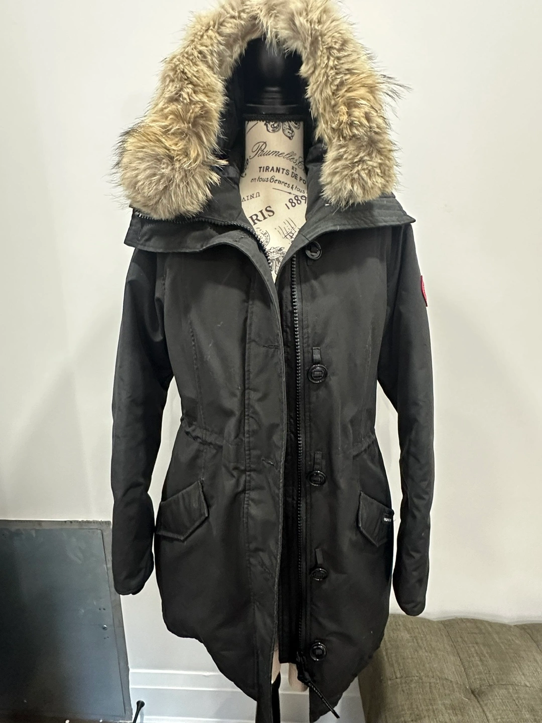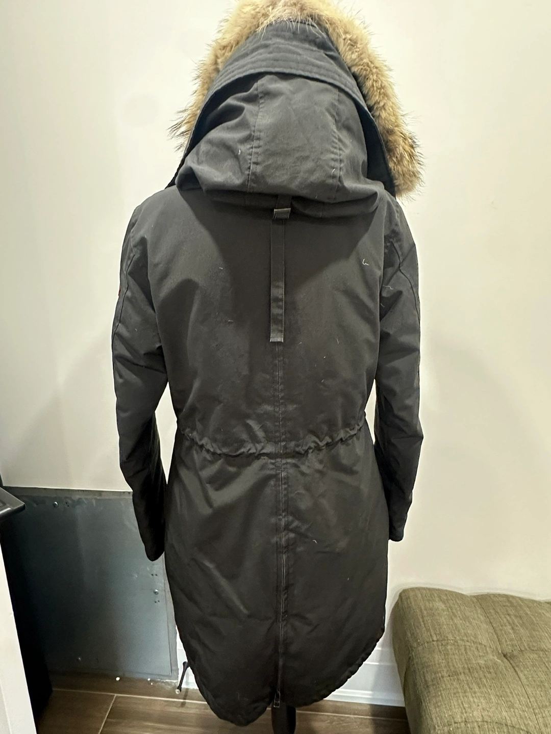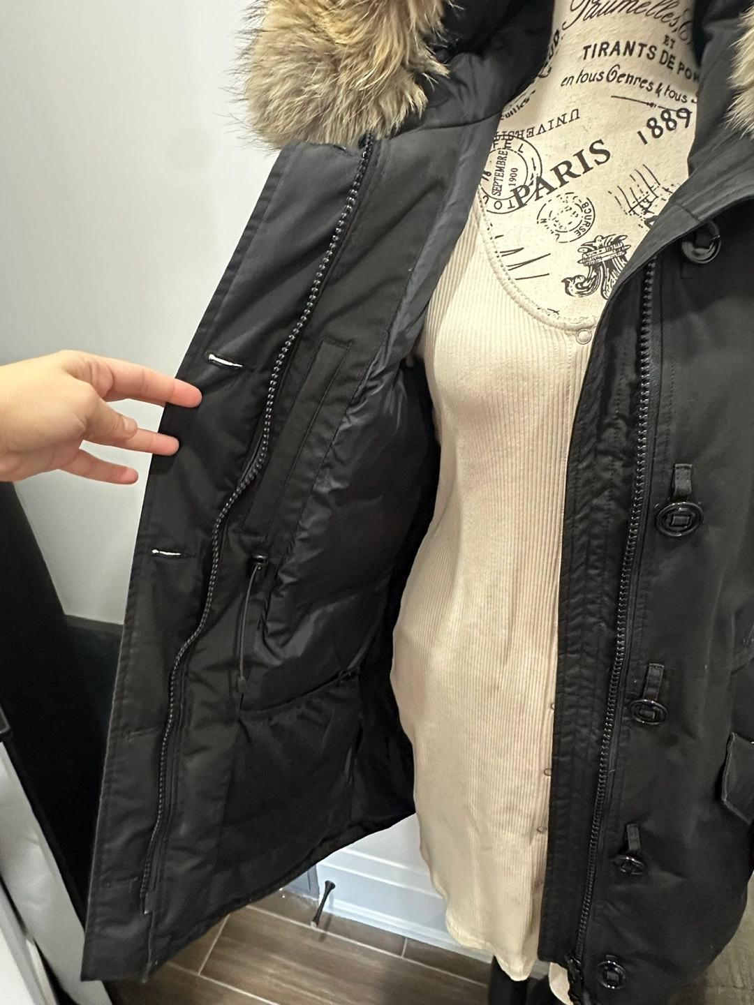 Black parka with fur hood, long sleeves, and multiple pockets.