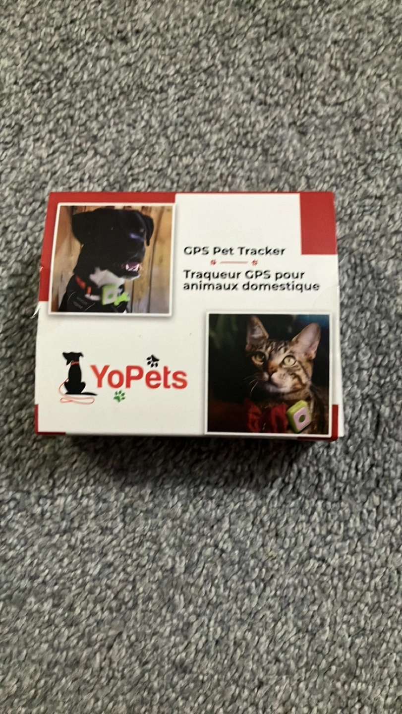 84GPS pet tracker for cats and dogs. Includes a small green tracker and a red collar.