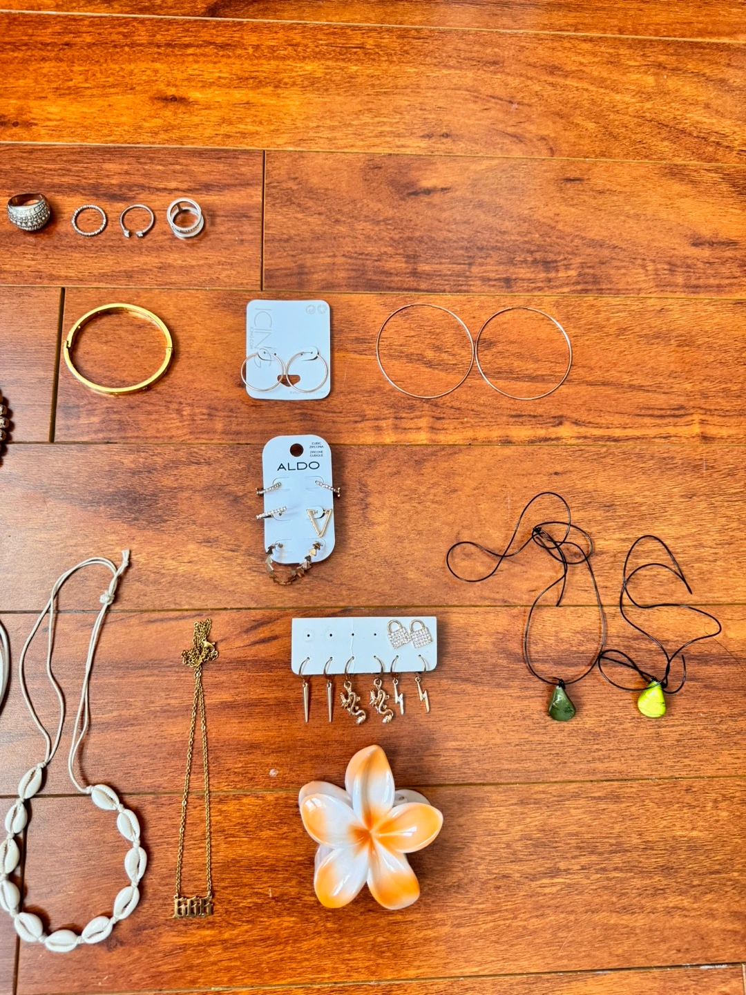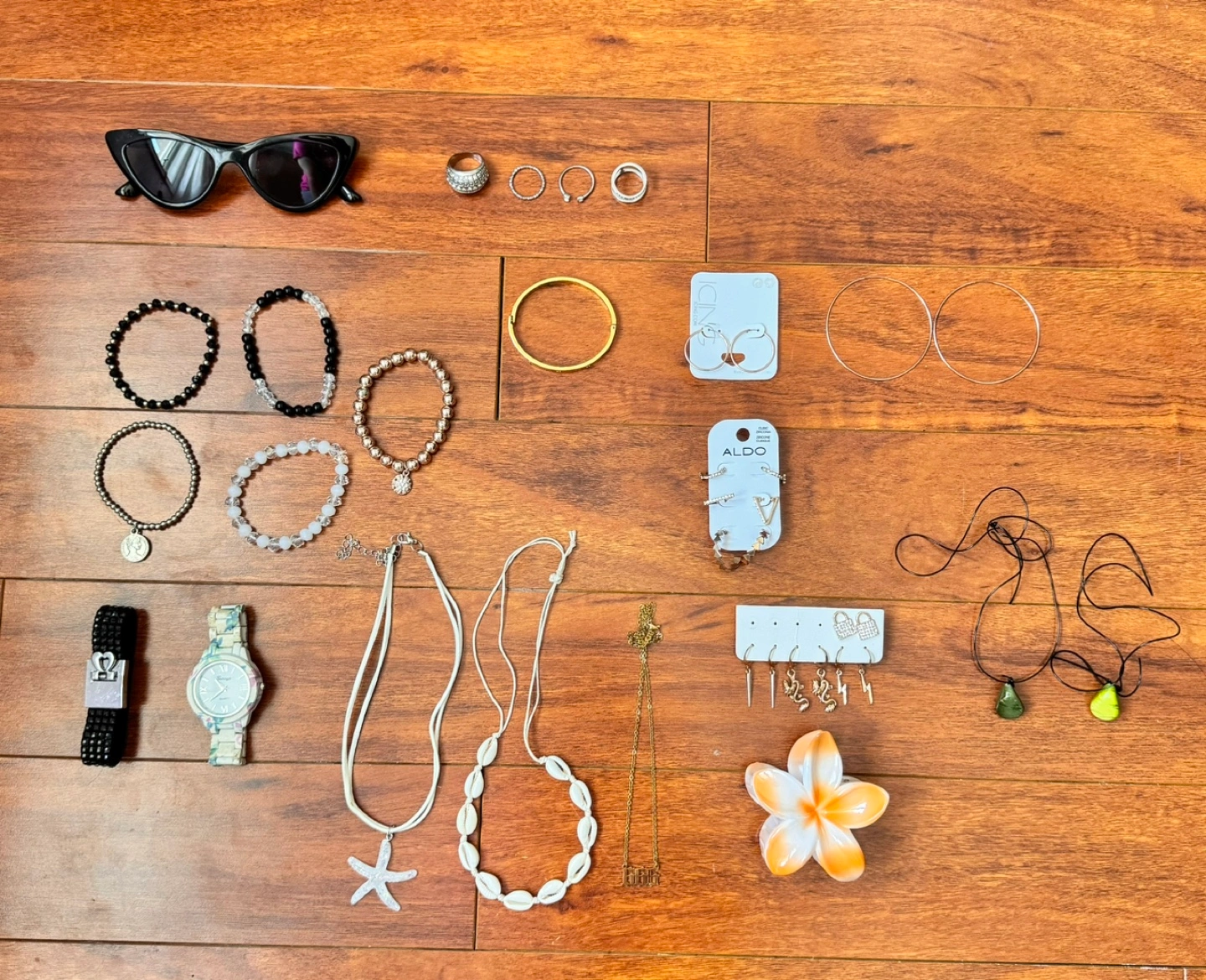 19Women’s Black Glasses - $15 5 Beaded Bracelets - $15 Gold Star Bracelet (Some damage) - $10 Chunky Silver Ring (Some Missing Gems) - $10 *SOLD* Double Layer Silver Ring (1 Gem Missing) - $10 2 Sleek Silver Rings Size 7 - $10 Orange Flower Hair Clip - $5 2 Green Plastic Stone Necklaces - $15 Starfish Necklace - $10 Seashell Necklace - $10 Black/Silver Bracelet - $10 Girl’s Watch (Unsure if it works) - $15 Small Gold Hoops - $10 3 Pairs Aldo Earrings - $15 Rose Gold Plastic Large Hoops - $5 *SOLD* 4 Pairs Gold Earrings - $6 666 Necklace - $10