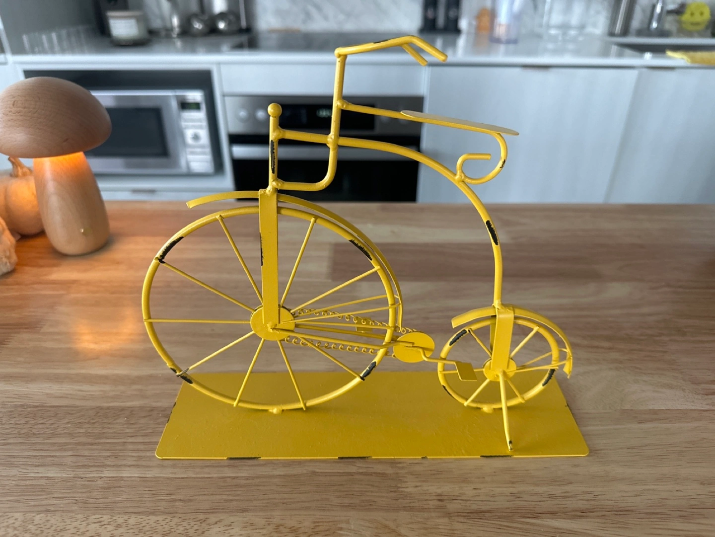 Yellow metal bicycle figurine. Great for adding a touch of whimsy to any space.