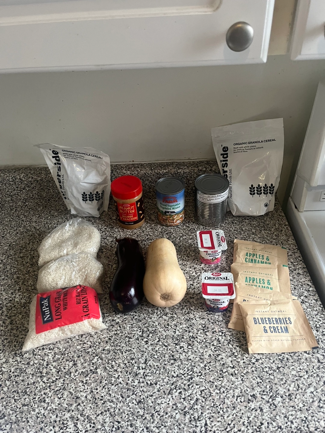 Assortment of grocery items including rice, peanut butter, canned vegetables, butternut squash, eggplant, and yogurt. Also includes individual serving packs of instant oatmeal. Free….. Bring your own bag First come first serve