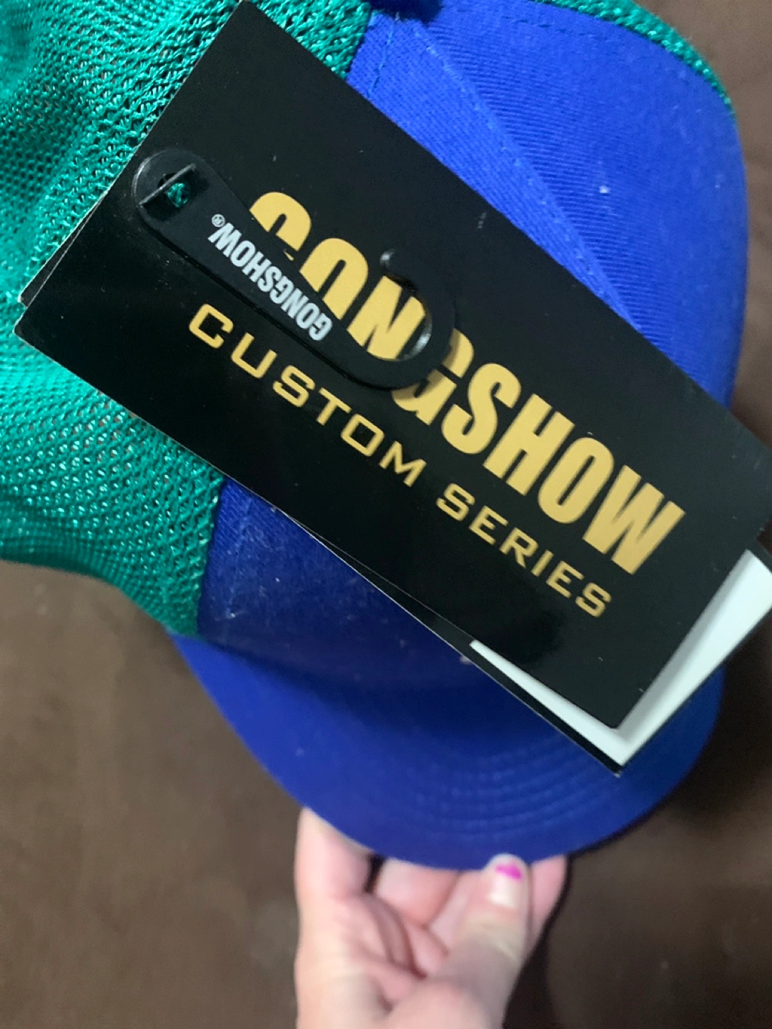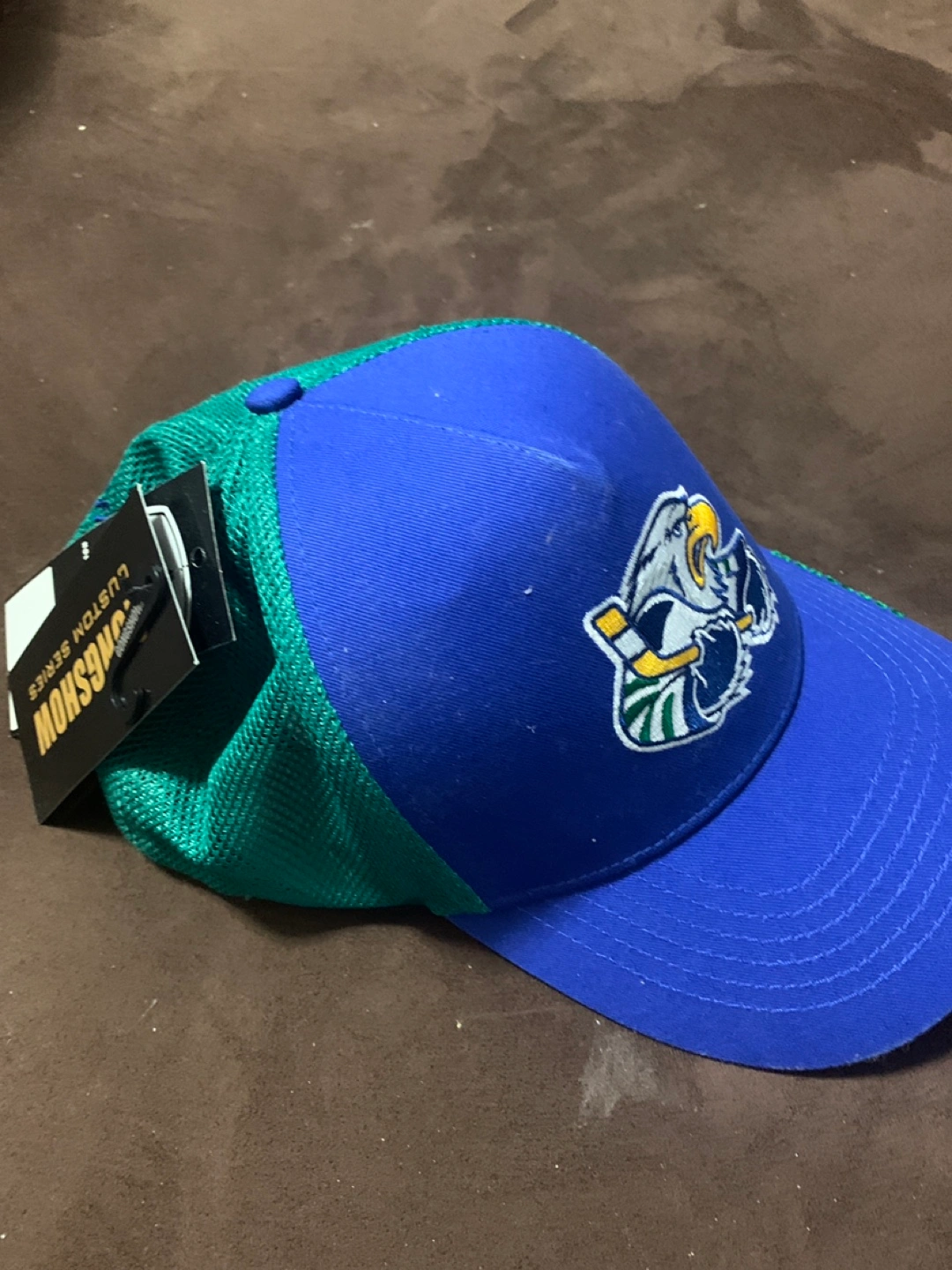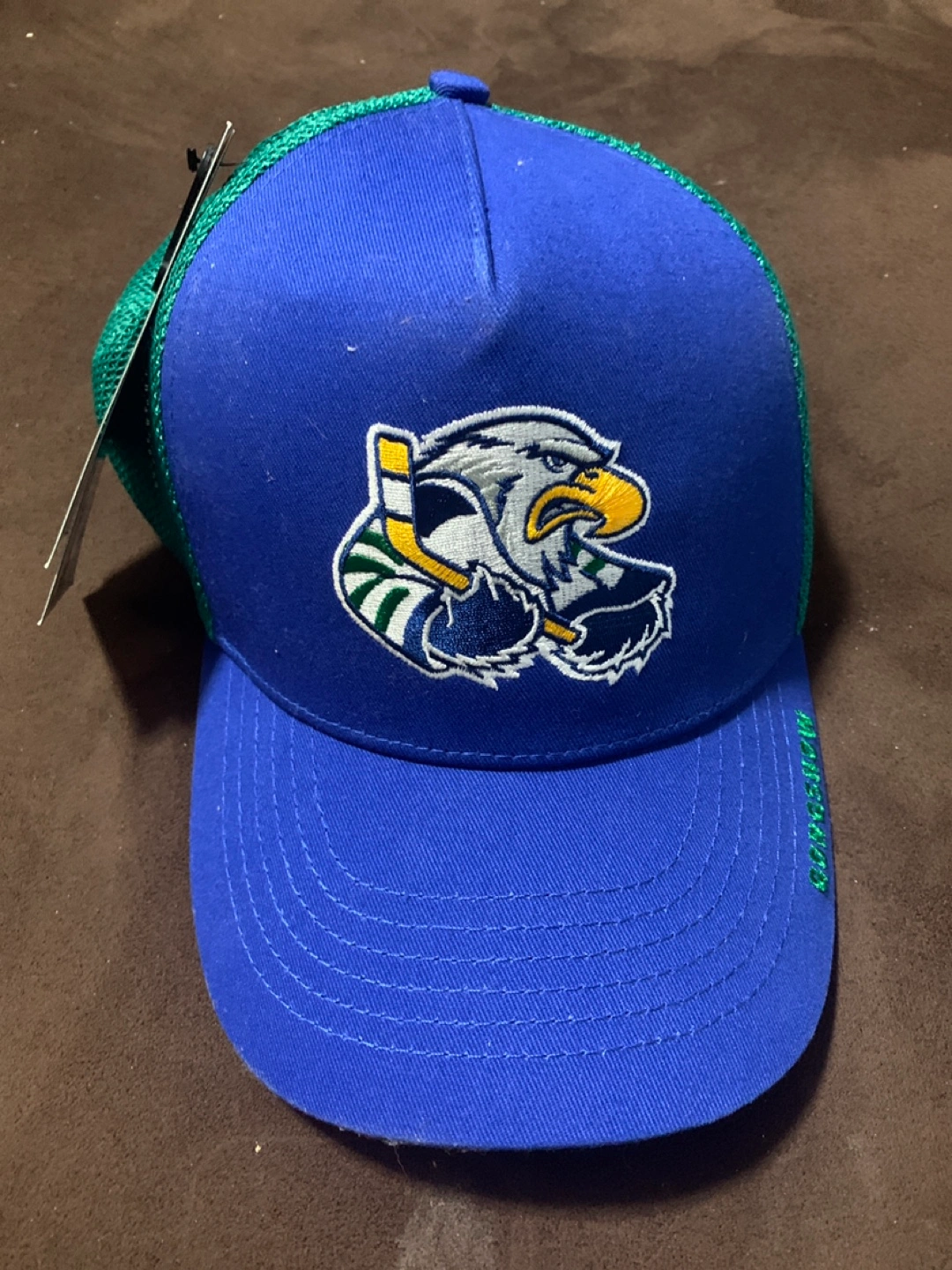 Blue and green baseball cap with an eagle logo. Adjustable back.