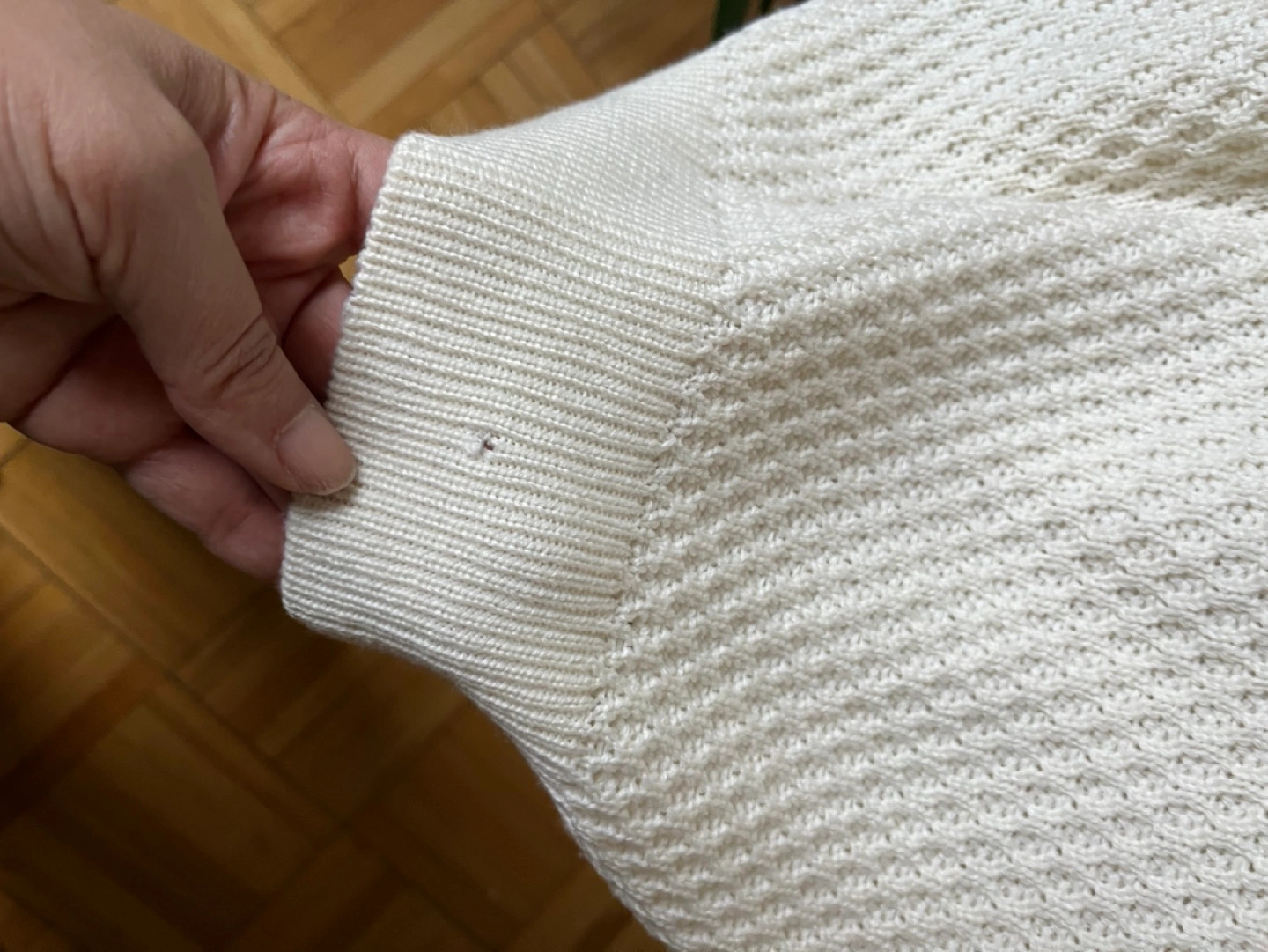 Has minor flaws (see pic) small hole near bottom, and two faint marks on sleeves