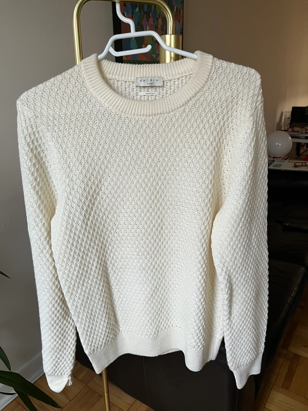 White knit sweater with a waffle texture. Long sleeves and crew neck. Made in Italy.