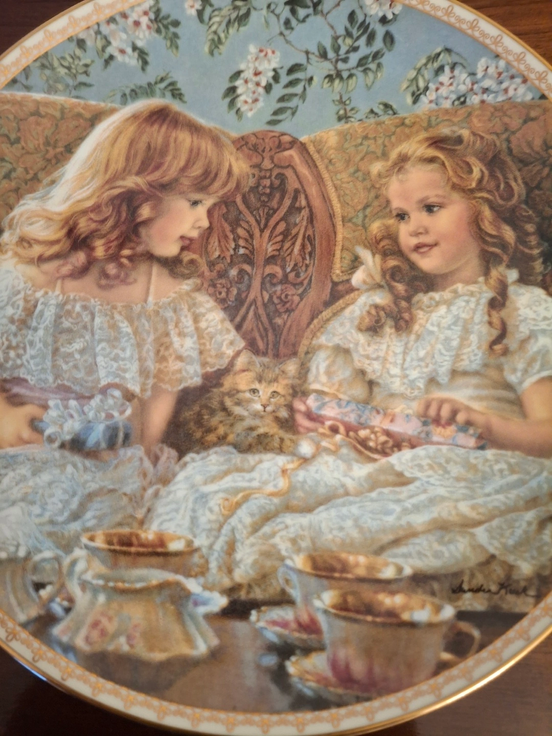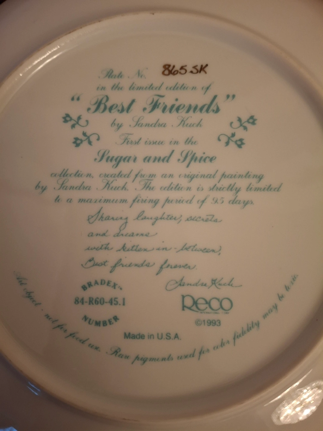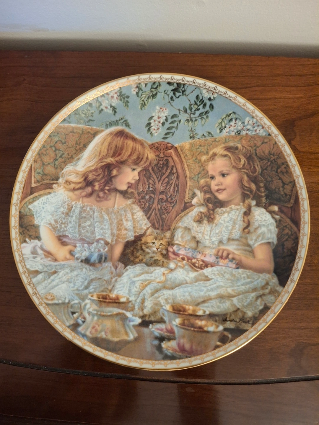 Limited edition collector's plate from the Sugar and Spice collection by Sandra Kuch. Features two girls having tea with a kitten. Vintage made in 1993. Available for pickup in Markland Wood.