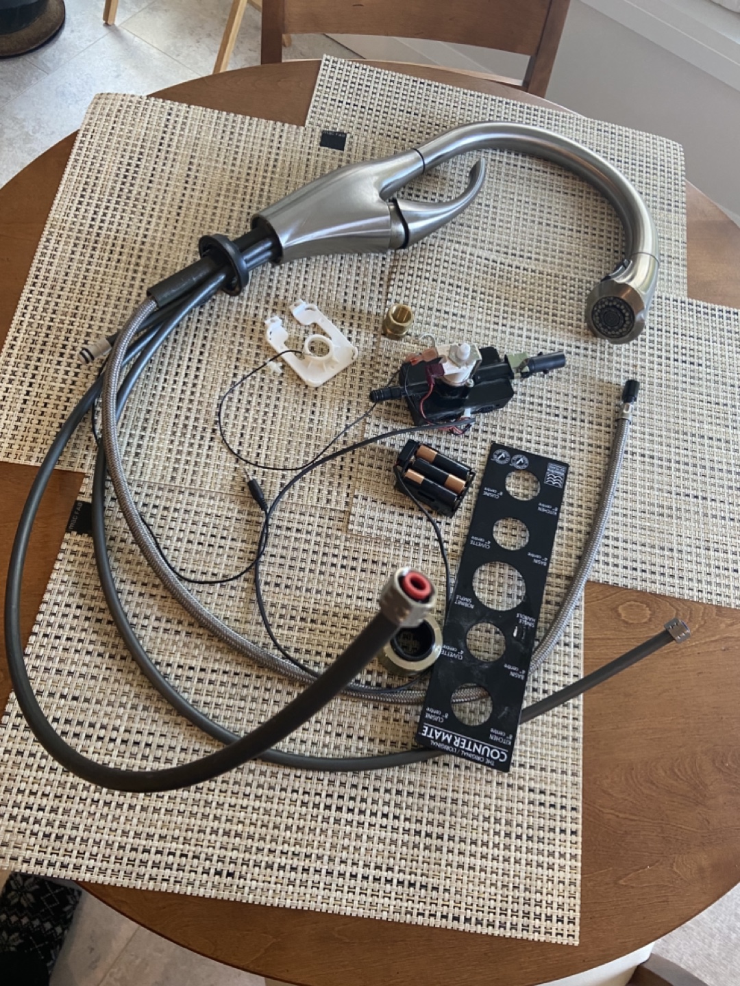 This is a high end touchless faucet though the touchless feature now only consistently works when the handle is touched. Needs a good cleaning. All available parts pictured pictures, batteries included.