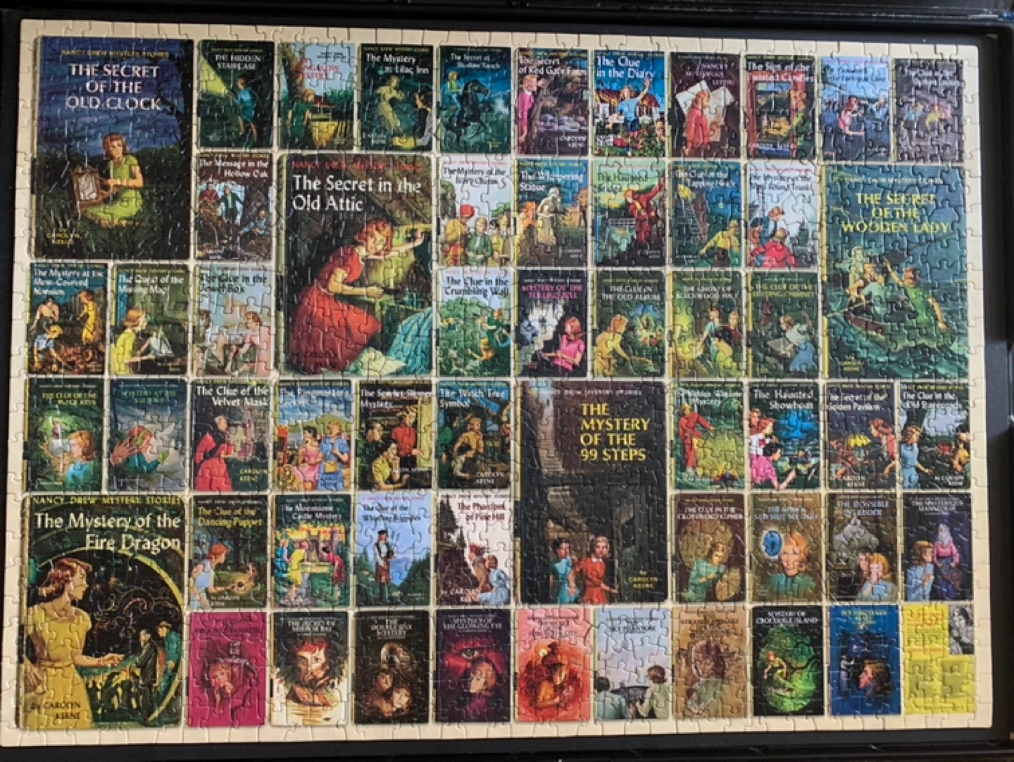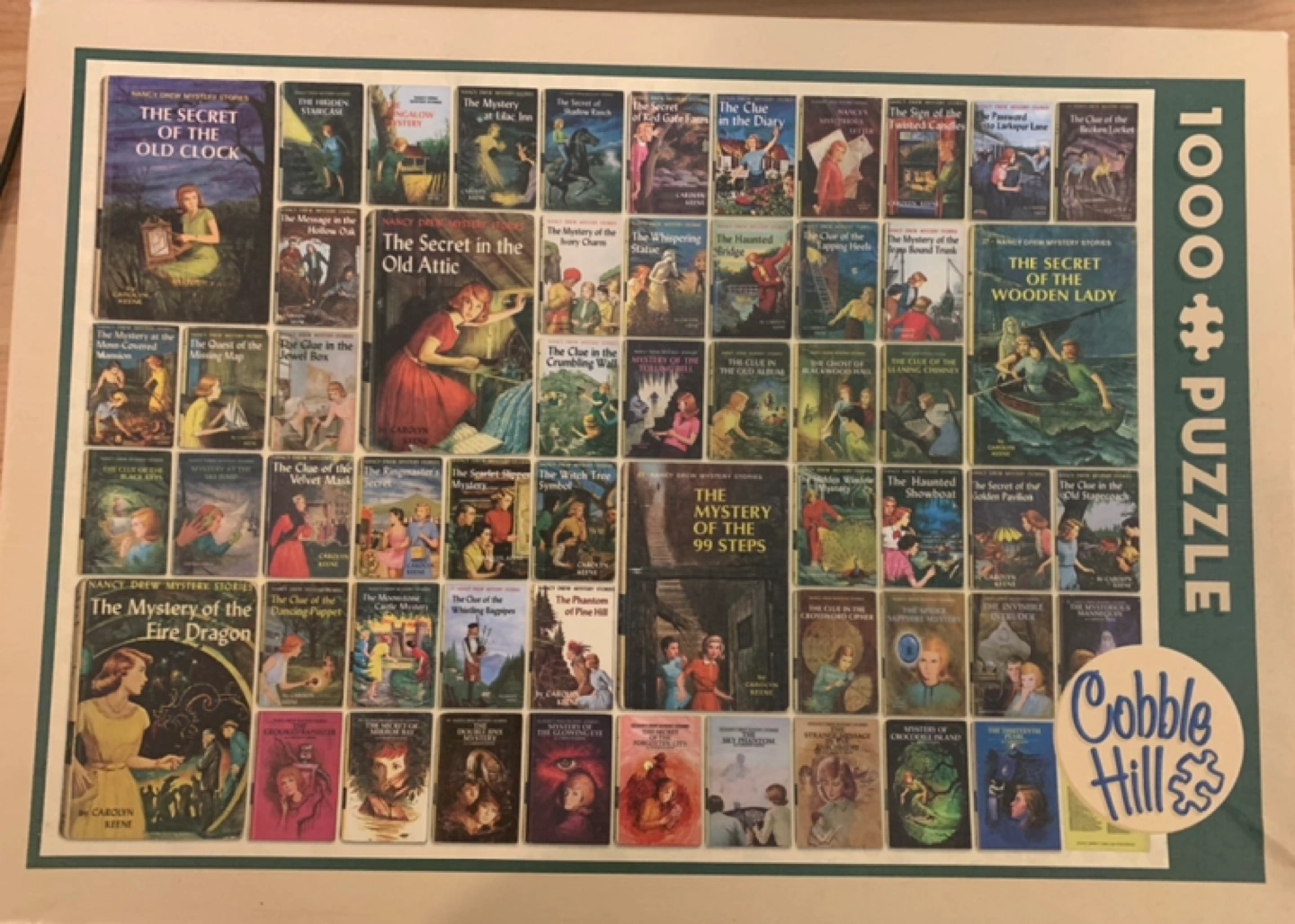 1000 piece jigsaw puzzle featuring Nancy Drew book covers.