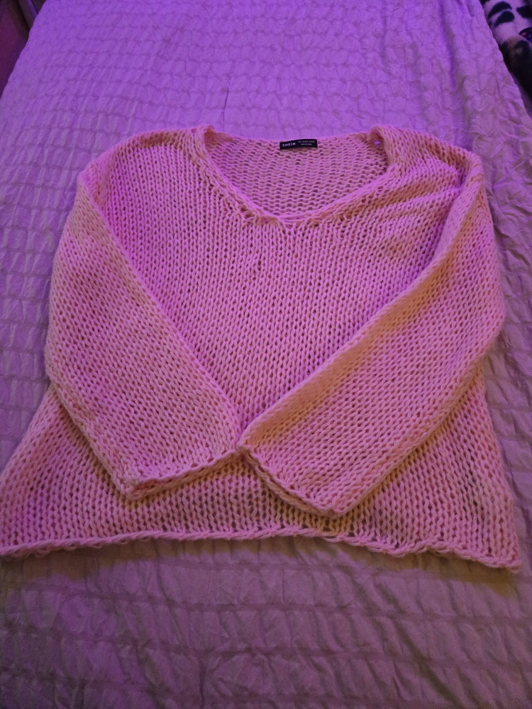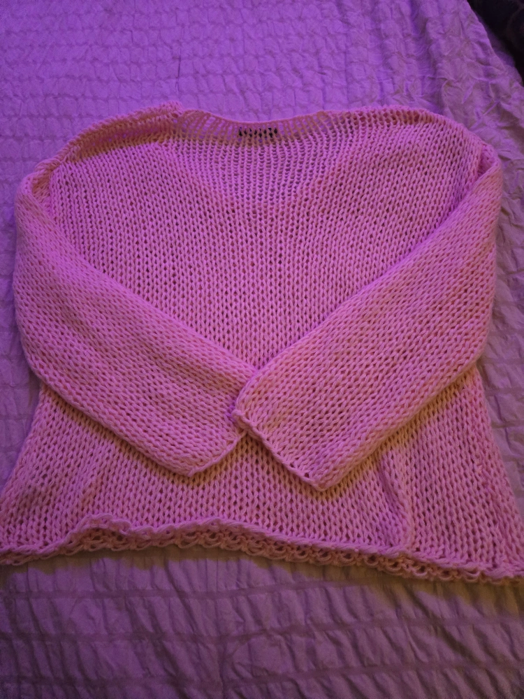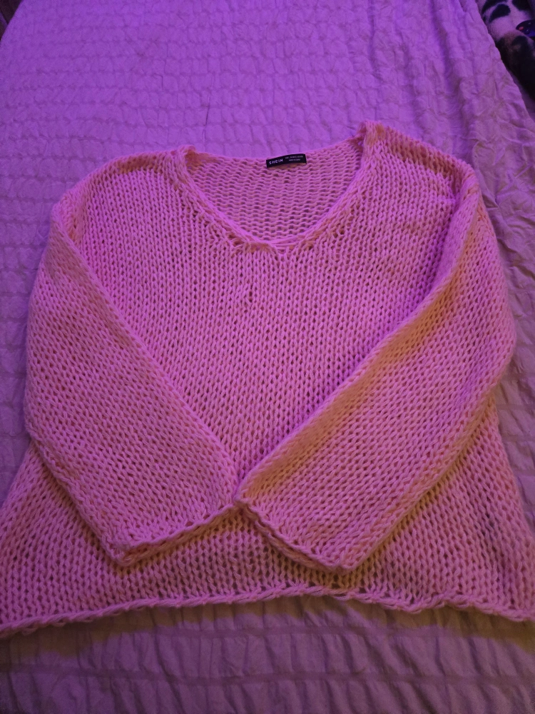 988Long-sleeved, light pink knitted sweater with a V-neck. Loose fitting and has a slightly cropped length.