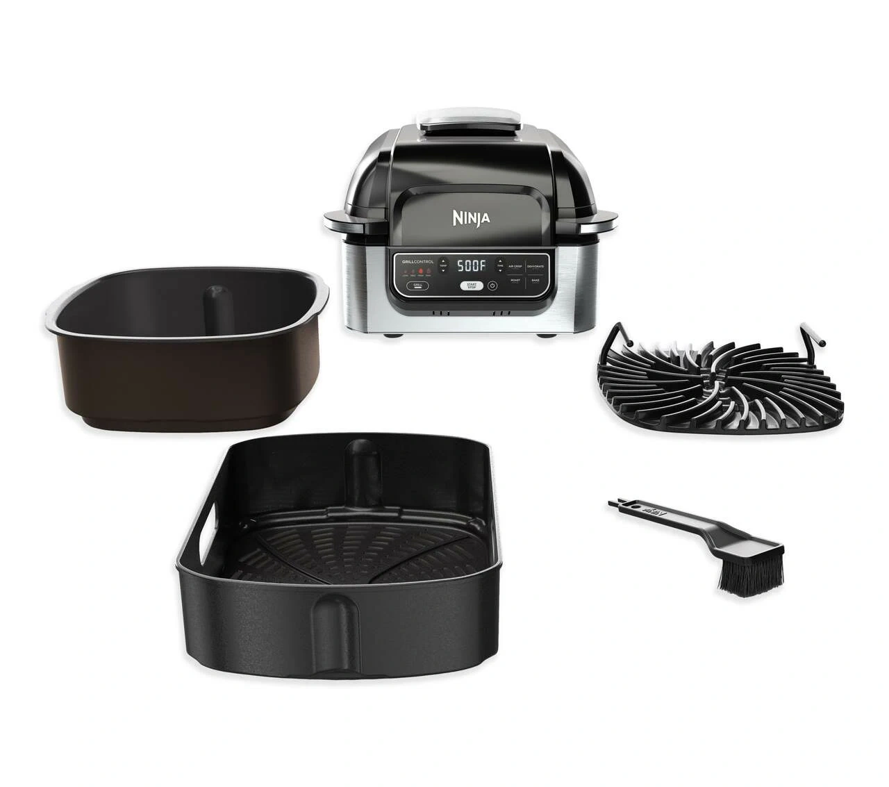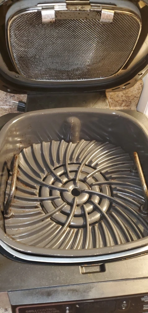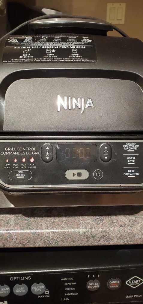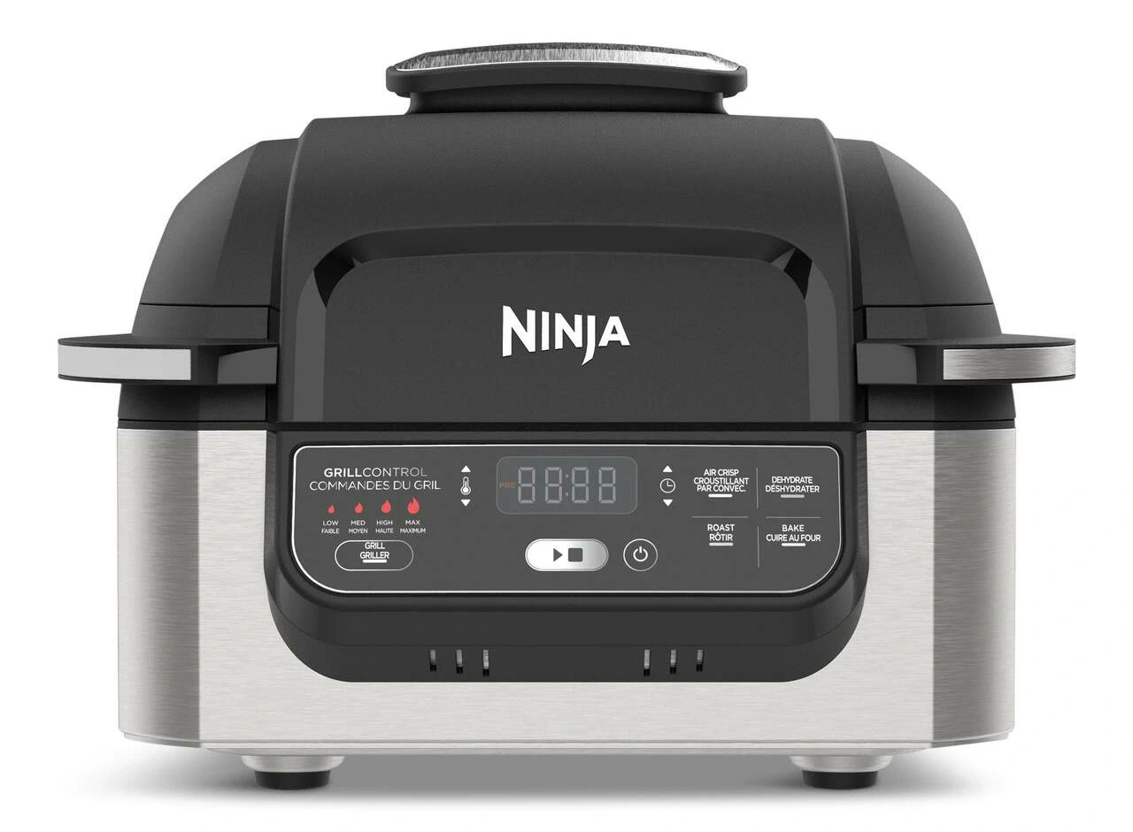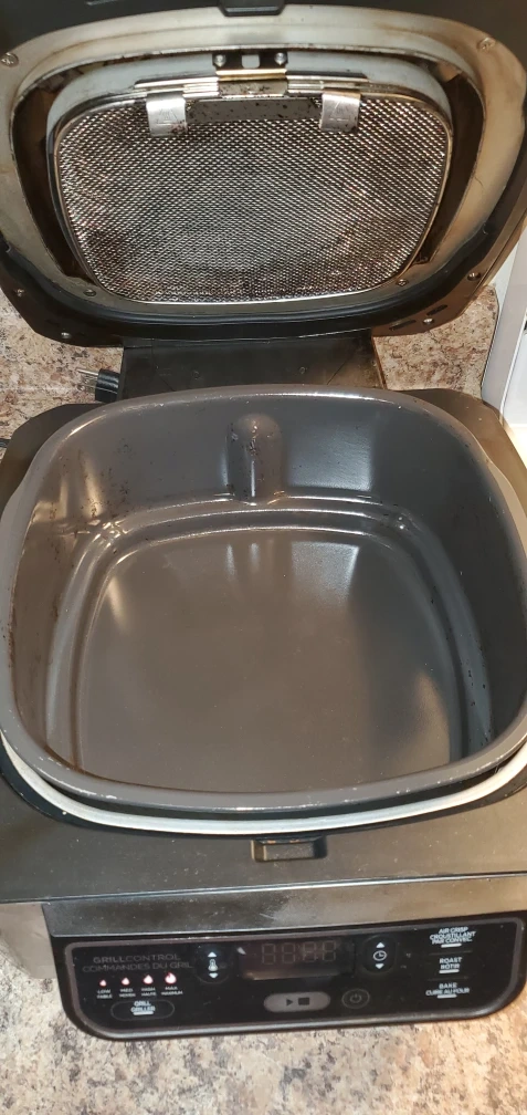 444Upgraded to a larger one so getting rid of this one. Works amazing! Ninja Foodi Grill. Air Crisp, Roast, Bake, Grill functions. Has a grill plate and air fryer basket included. The Ninja® Foodi™ Grill, the grill that sears, sizzles, and air fry crisps™ Perfectly cook food on the inside and char-grill every side with superhot Cyclonic Grilling Technology 500F air circulates around food for amazing Surround Searing, while the 500F high-density grill grate creates char-grilled marks and flavours Perfect char-grilled results with Grill Control settings: Low, Medium, High, and Max The wide temperature range of 250F–500F and variable fan speed enable 4 fast, versatile cooking functions: Grill, Air Crisp, Roast, and Bake Air fry crisp with up to 75% less fat than deep frying (tested against hand-cut, deep-fried French fries), using the included 4-qt crisper basket Easy-to-clean, PTFE/PFOA-free, ceramic-coated removable grill grate, crisper basket, and cooking pot are dishwasher safe Transform foods from frozen to perfectly char-grilled in 25 minutes With the BTU cooking power of an outdoor grill, it brings outdoor grill flavors conveniently to your countertop any day of the year Intuitive digital display makes it easy to choose your cooking function, temperature, and cook time Grill 4 7-oz salmon fillets in 8 minutes, 4 4-oz beef burgers in 6 minutes, or 2 12-oz N.Y. strip steaks in 11 minutes 10 x 10 PTFE/PFOA-free, nonstick, ceramic-coated grill grate 4-qt PTFE/PFOA-free, nonstick, ceramic-coated crisper basket 6-qt PTFE/PFOA-free, nonstick, ceramic-coated cooking pot