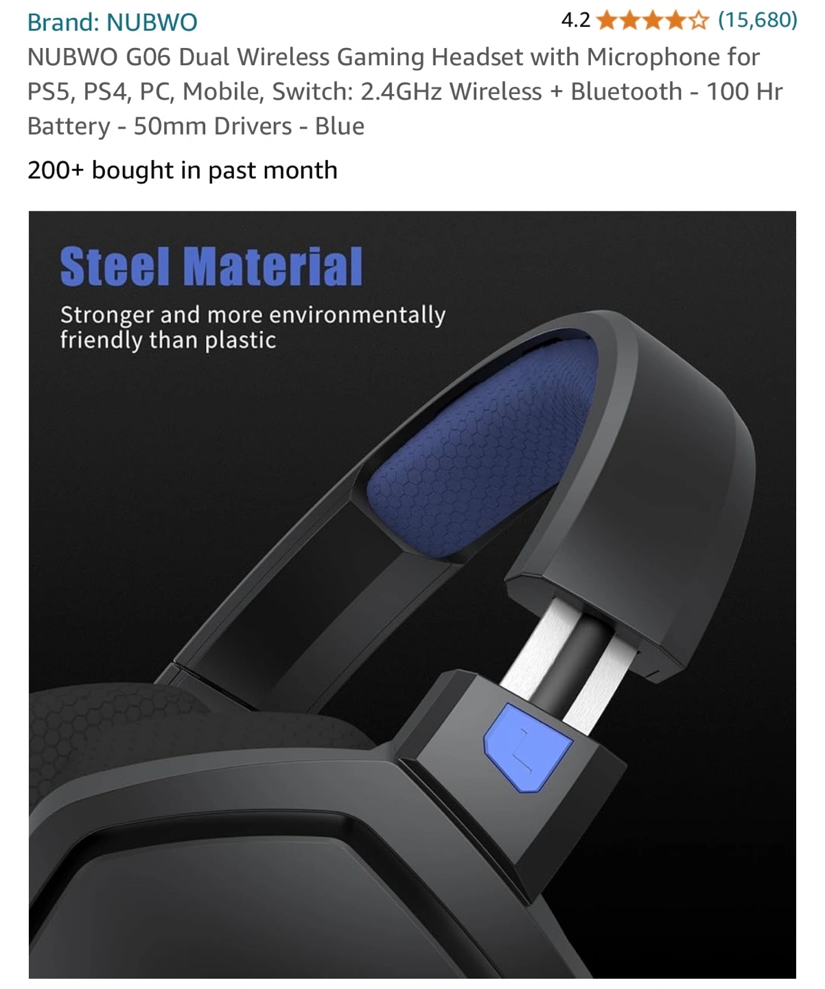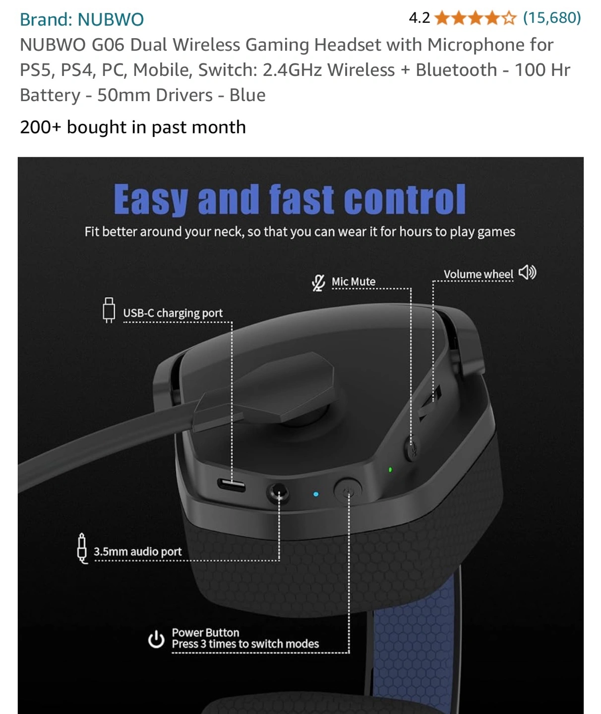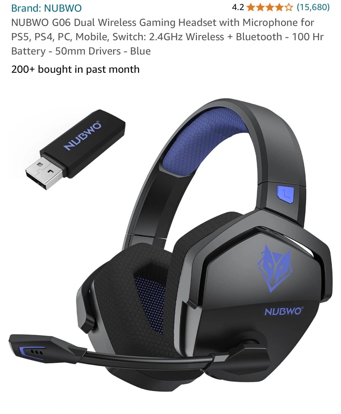 Brand New NUBWO G06 Dual Wireless Gaming Headset with Microphone for PS5, PS4, PC, Mobile, Switch: 2.4GHz Wireless + Bluetooth - 100 Hr Battery - 50mm Drivers - Blue