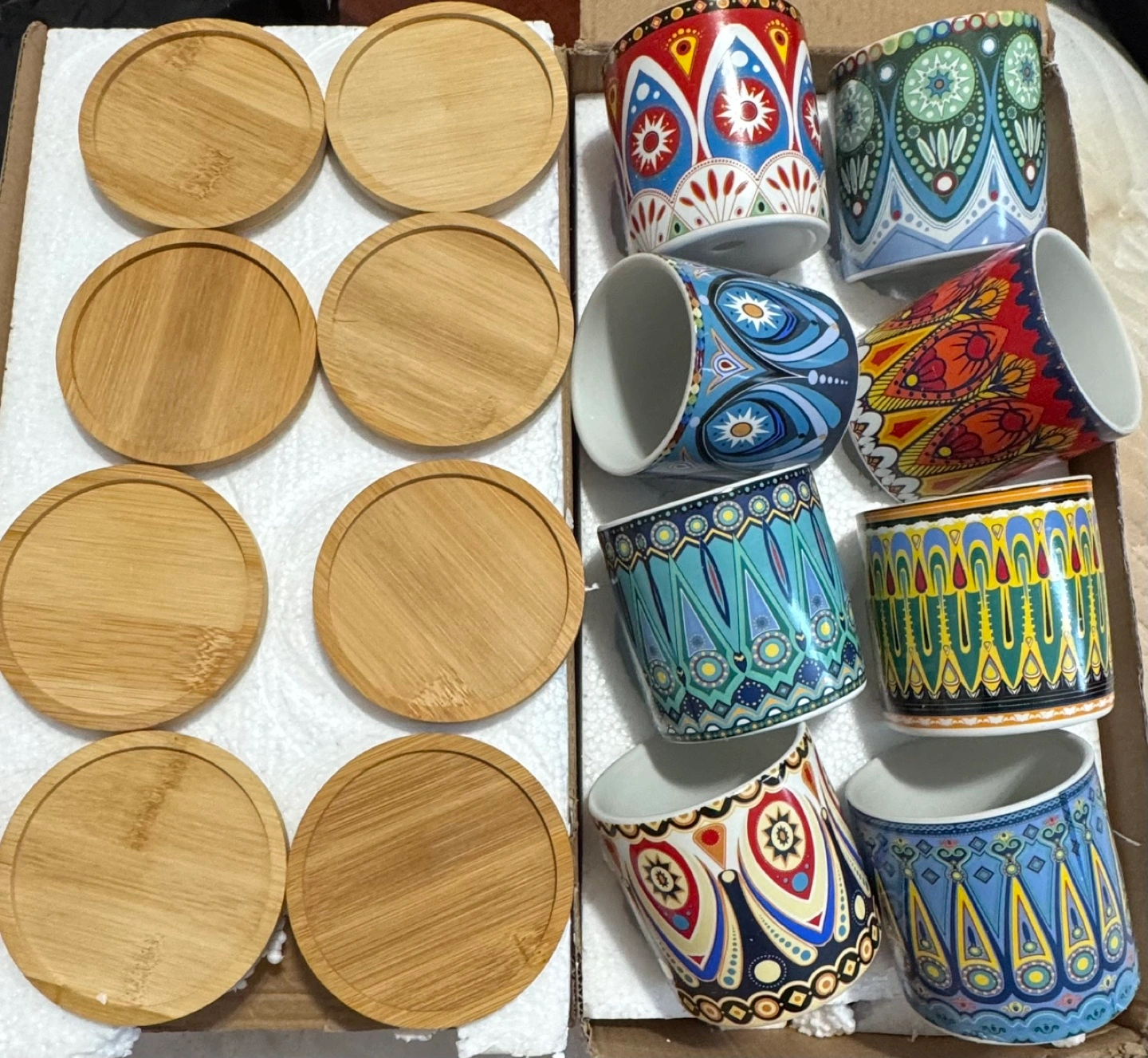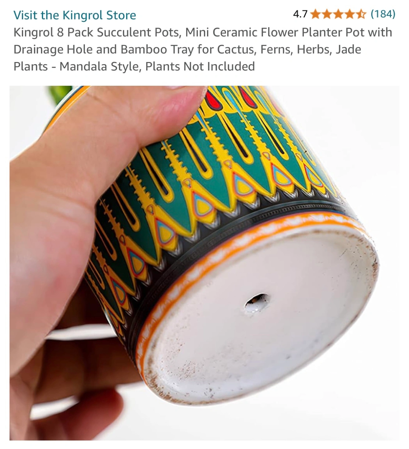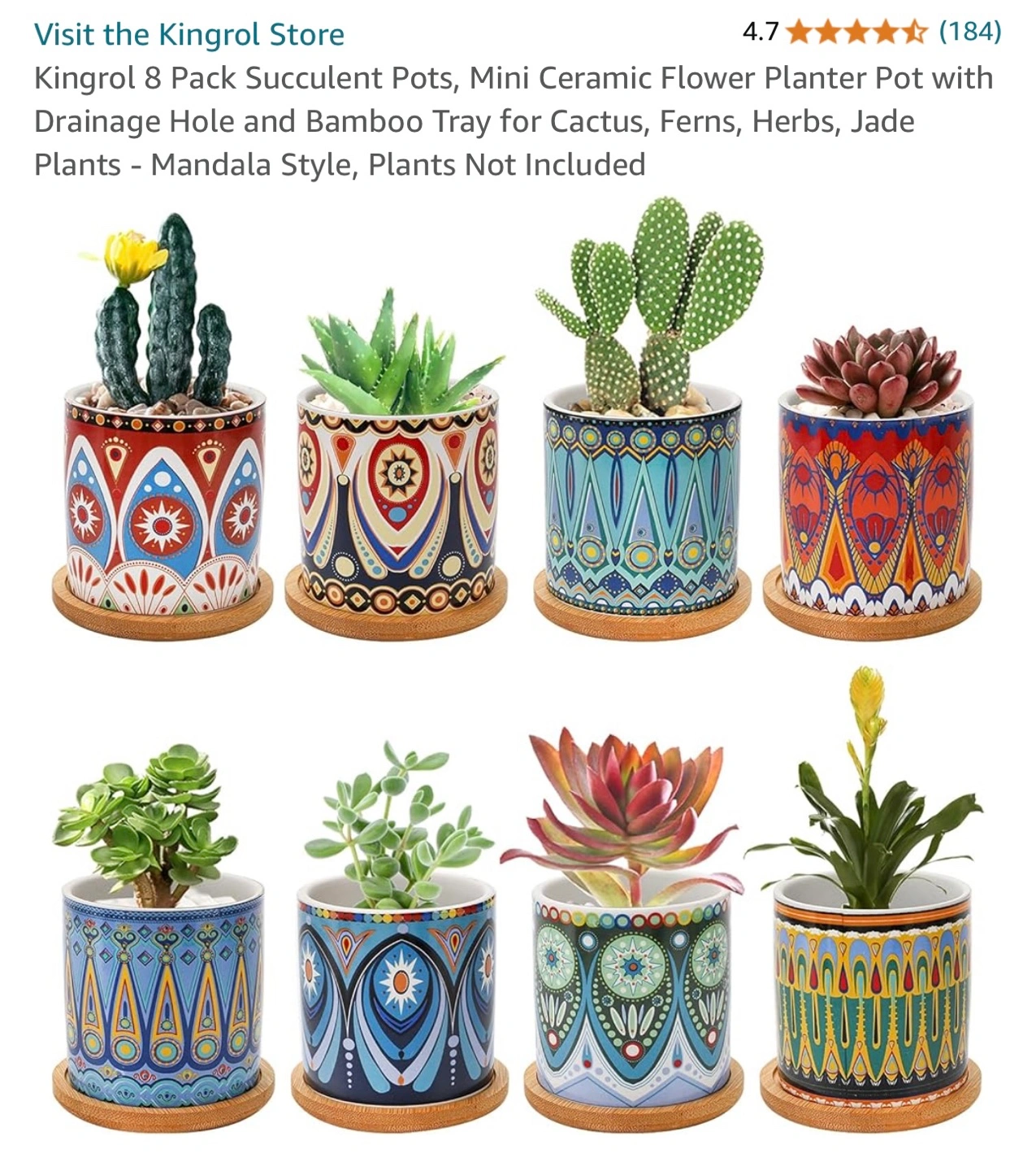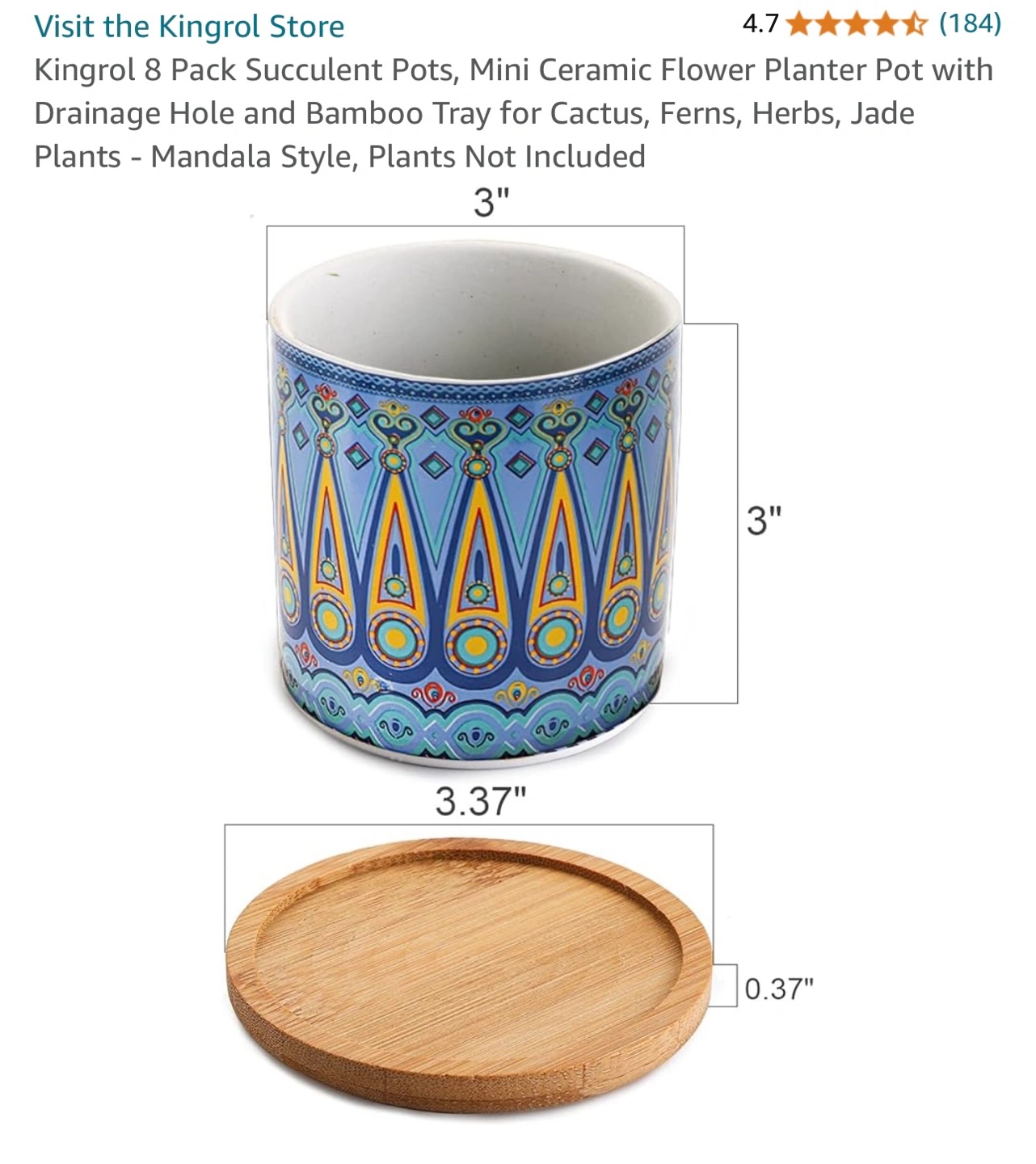Set of 8 small ceramic pots with drainage holes. Includes 8 matching bamboo coasters. Perfect for succulents, herbs, ferns, and small plants.