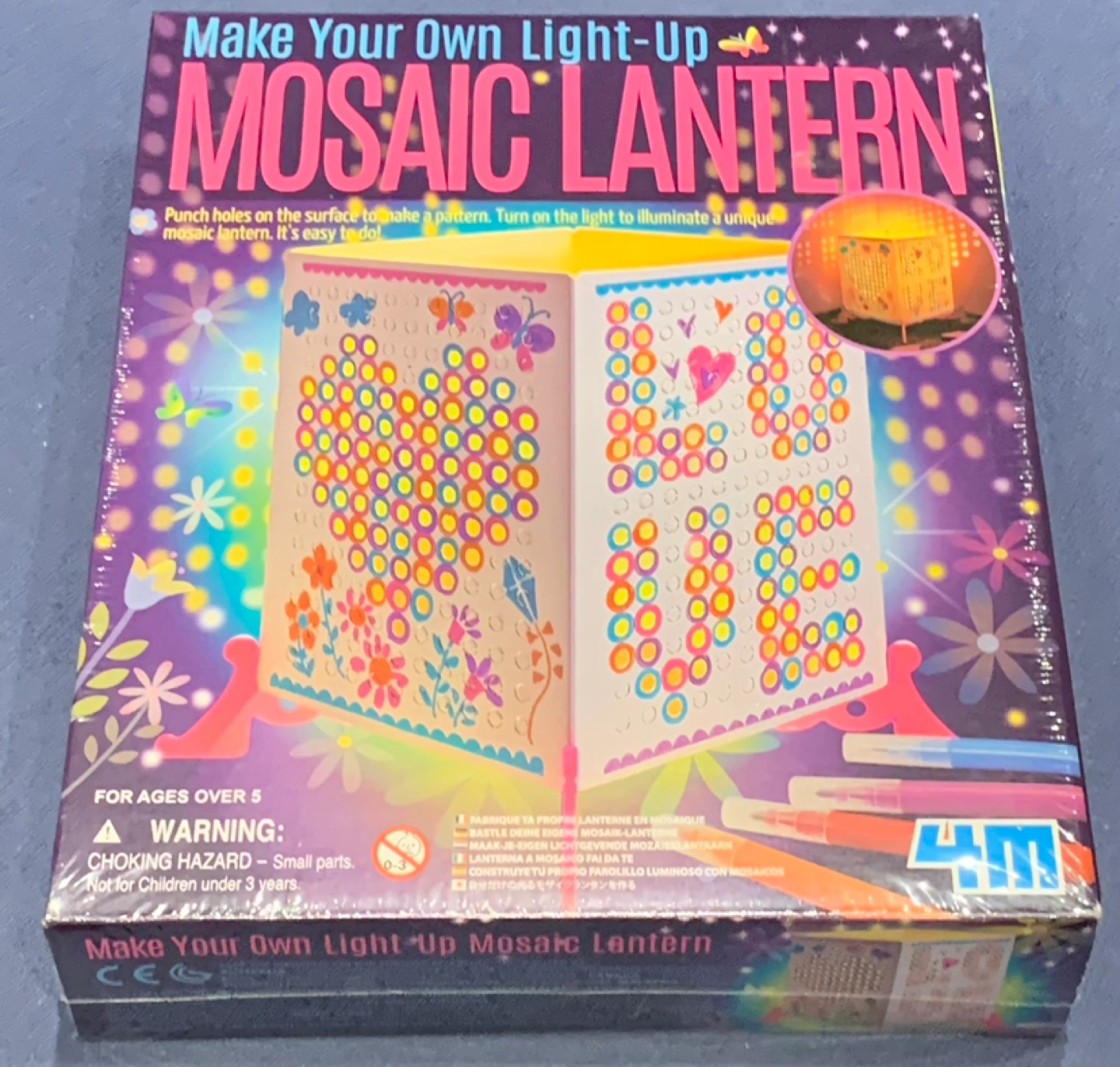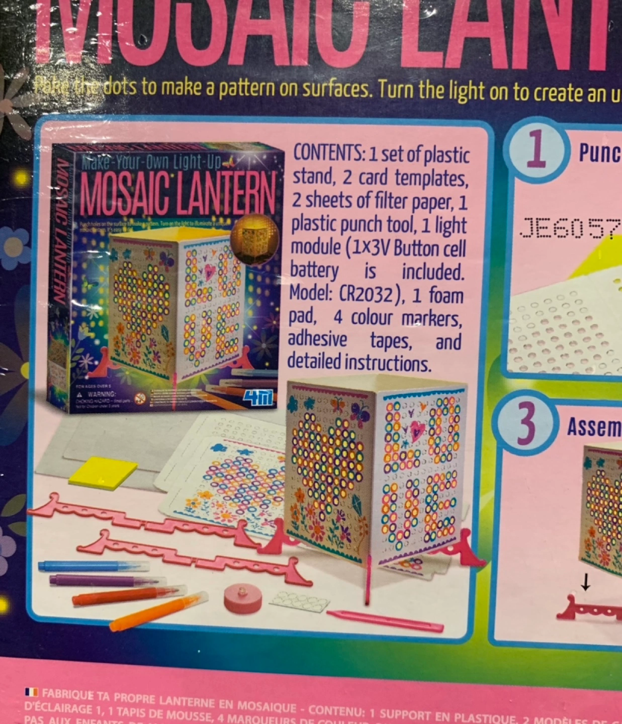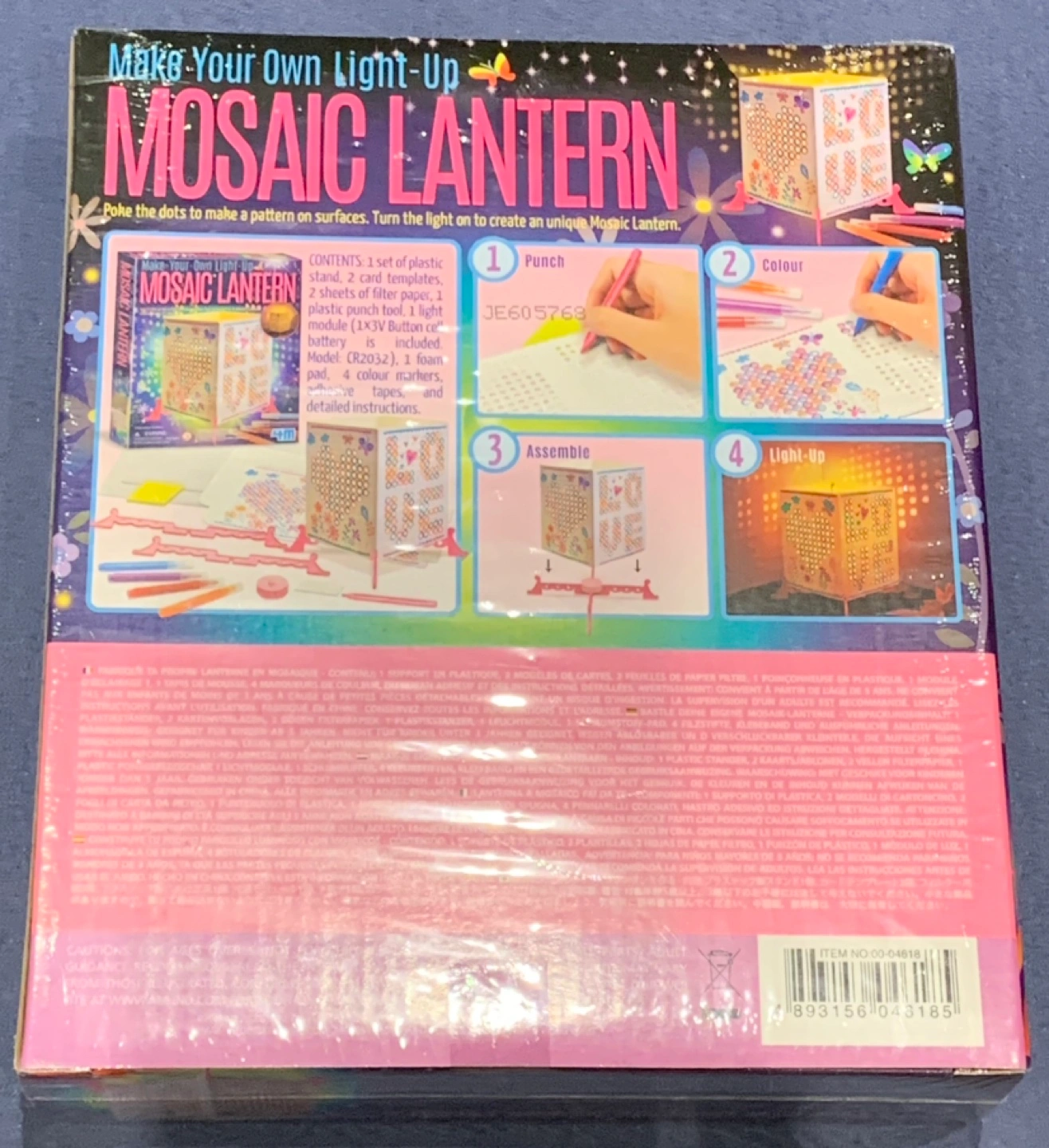 242BRAND NEW - Light-up mosaic lantern craft kit. Includes stand, templates, punch tool, filter paper, light module (battery included), foam pad, adhesive tapes, colour markers, and instructions. Perfect craft to bond with your little one! Ages 5 and over