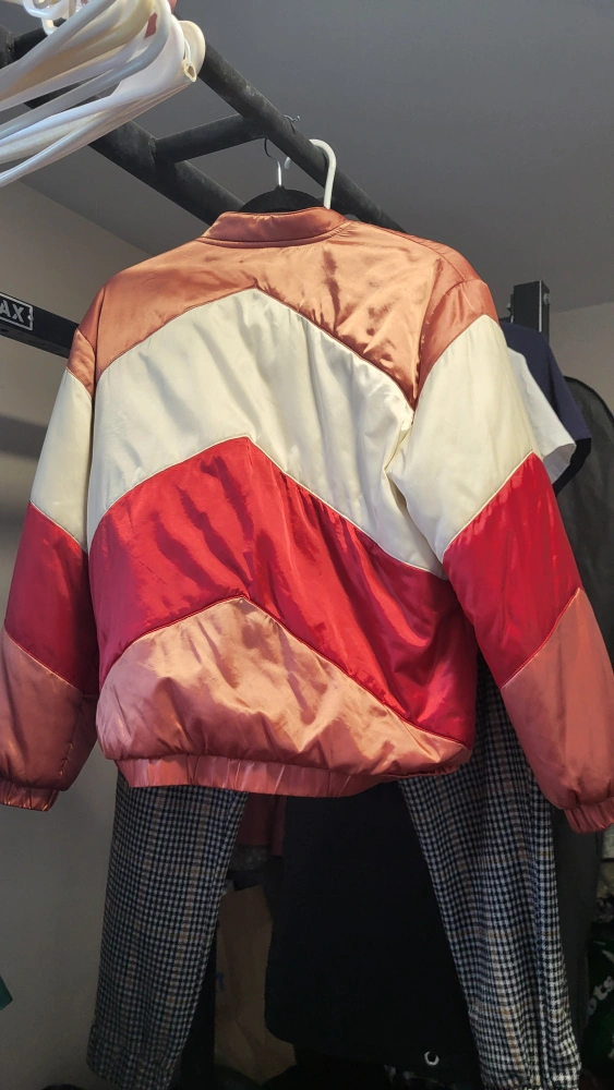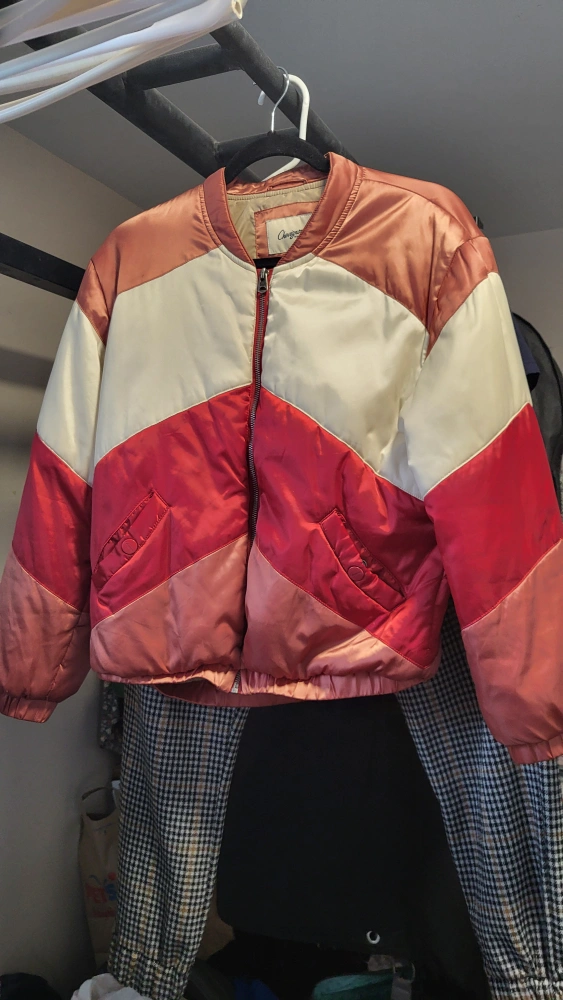 Red, white, and pink bomber jacket with a chevron pattern. Zipper closure. Two pockets. Located in downtown Toronto ( Yonge/Sherbourne and Bloor and Sherbourne and Wellesley) Cash or etransfer is fine.