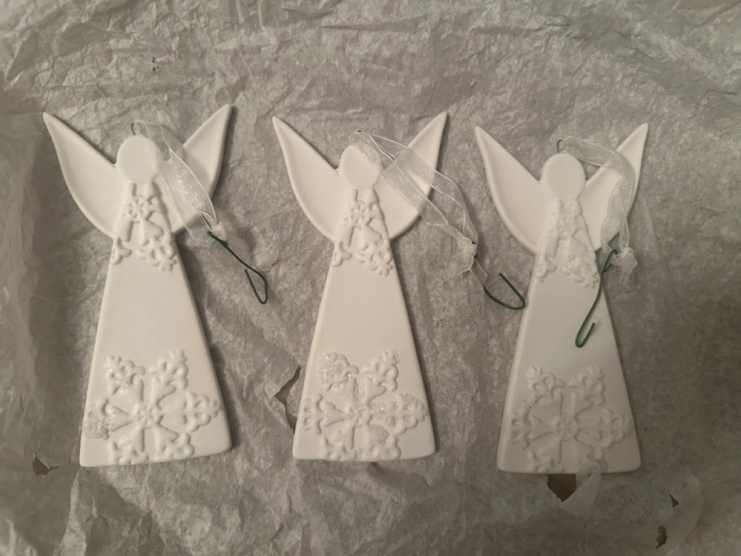 Set of three white pottery angel ornaments. Each ornament features a snowflake design and comes with a white ribbon and wire hook.