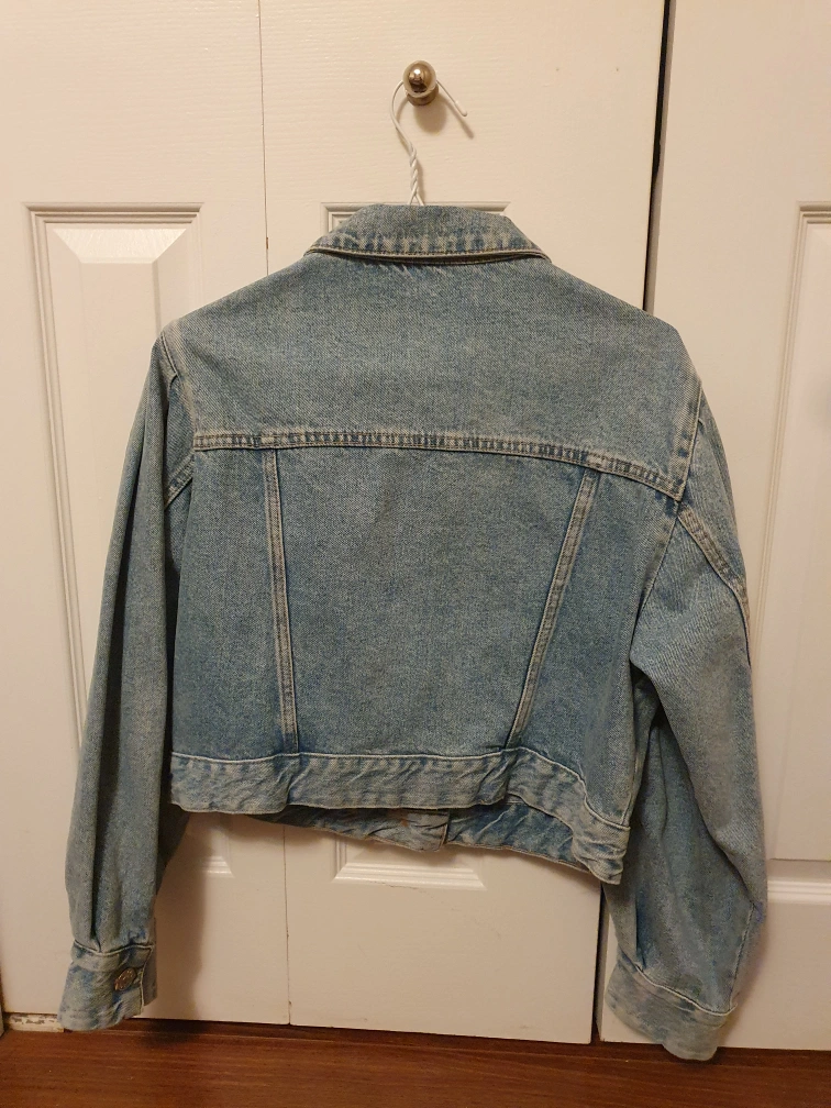 Light blue denim jacket with puffed sleeves.