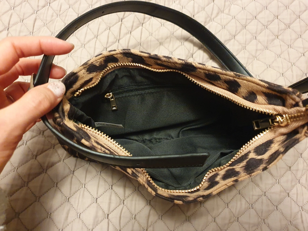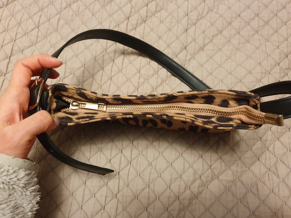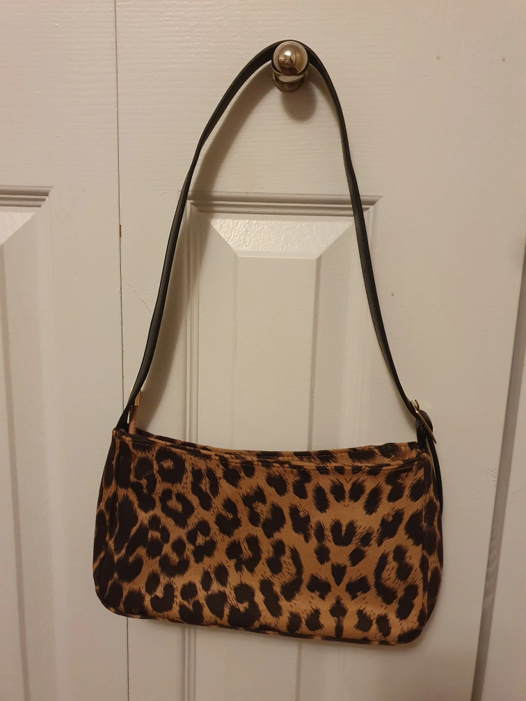 Small, shoulder bag with a zipper closure. Features a leopard print design and black strap. Includes a small interior pocket.
