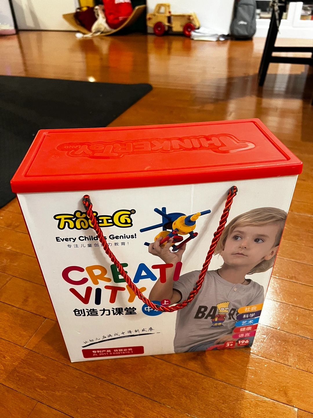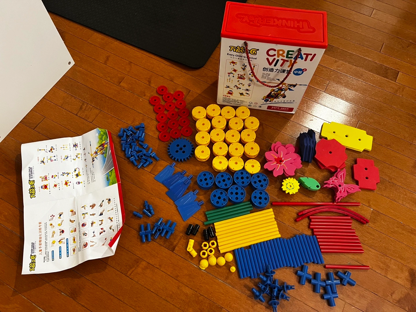 Building set with various colourful pieces, including rods, connectors, wheels, and flowers. Comes in a carrying case. Original 196 pieces, 4 pieces missing (see last picture). Pick up only.
