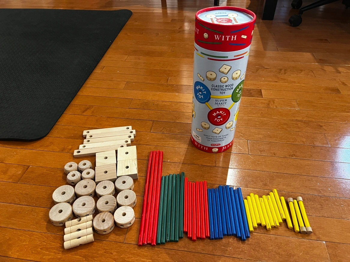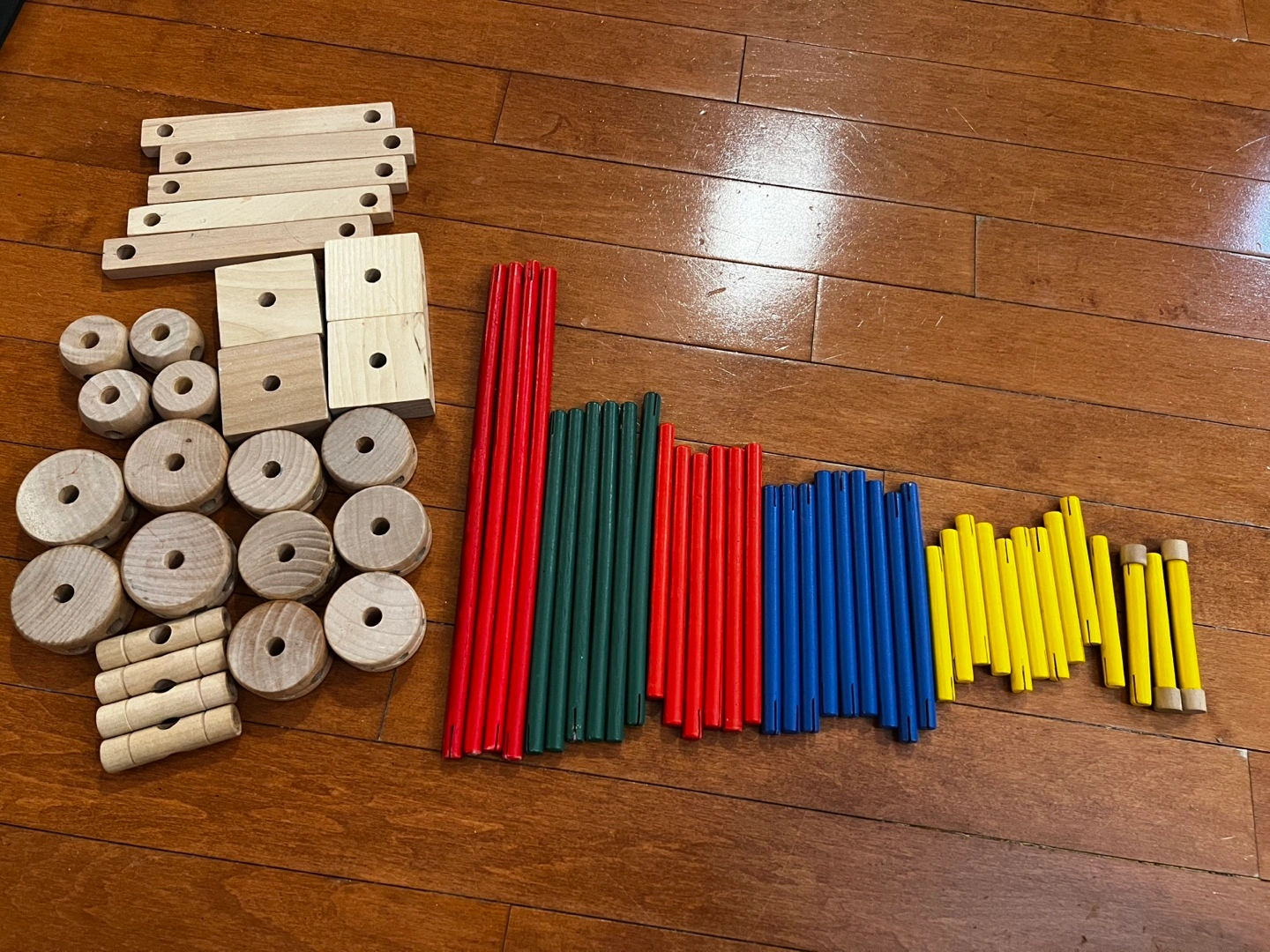Classic wooden construction toy. Includes various pieces: wheels, blocks, and coloured sticks. Excellent for building and creativity. 69 pieces (one missing from the original 70-piece set). Pick up only.