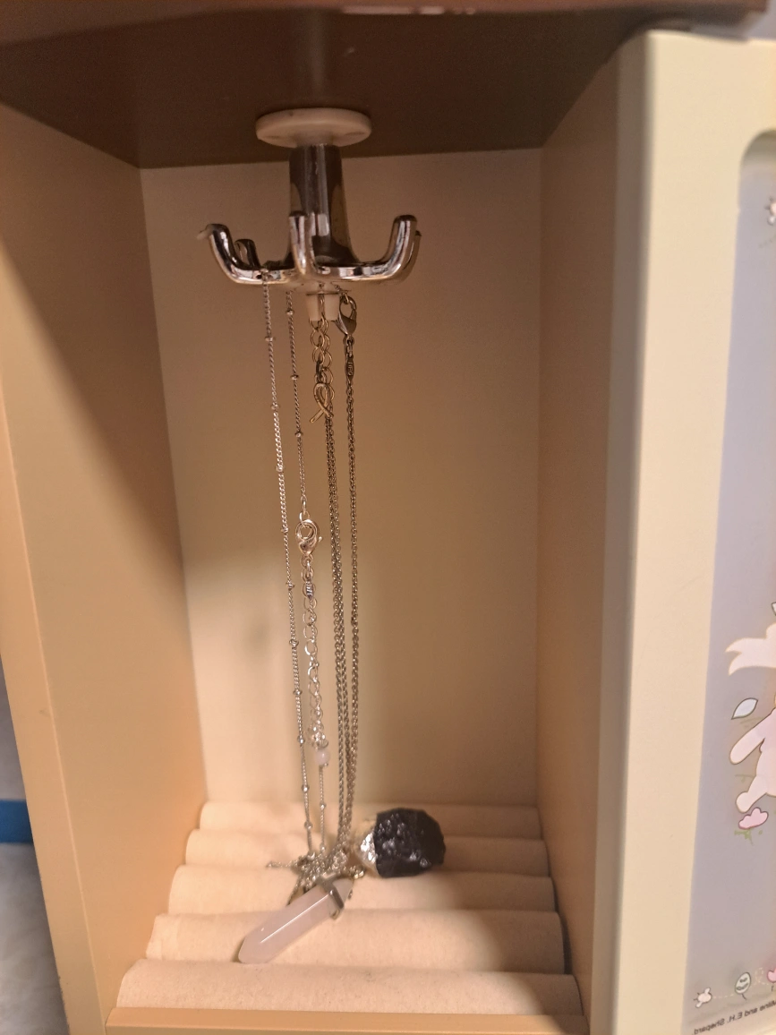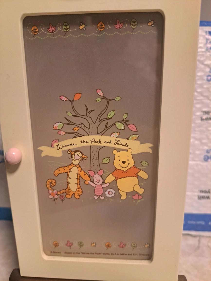Small wooden jewelry box with a drawer and a door that opens to reveal hooks for necklaces and a ring holder. Winnie the Pooh, and friends are featured on the door. Excellent Christmas present