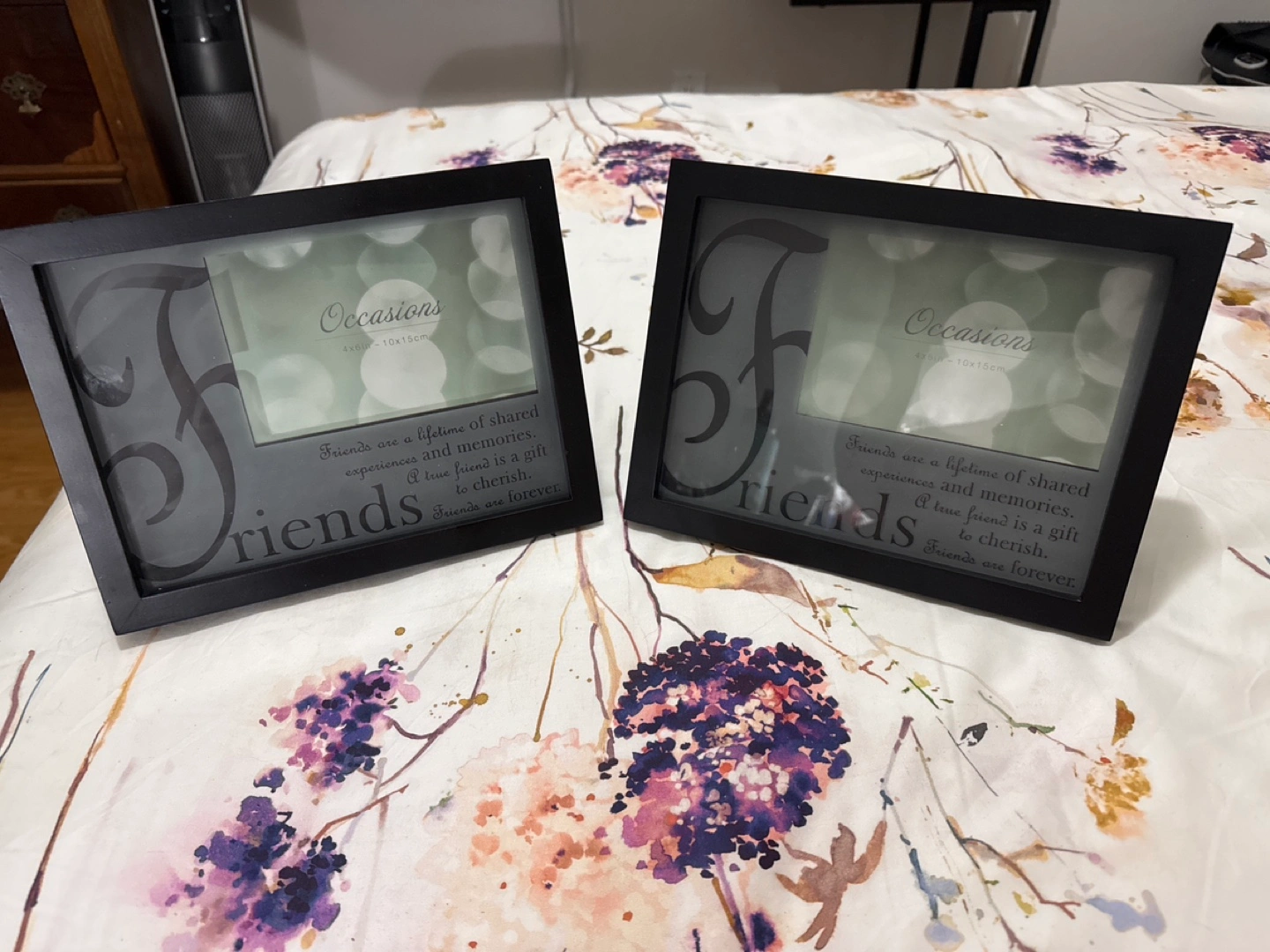 Black picture frames with 'Friends' inscription and glass front. Holds a 4x6 in picture. Price is for set of 2 frames.