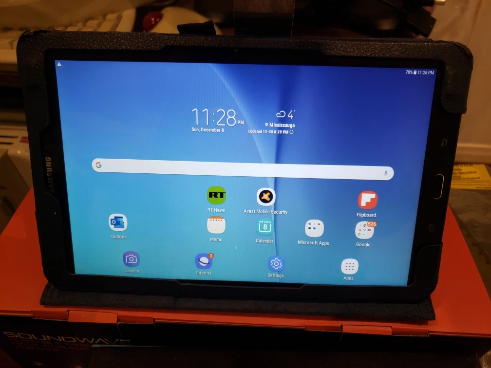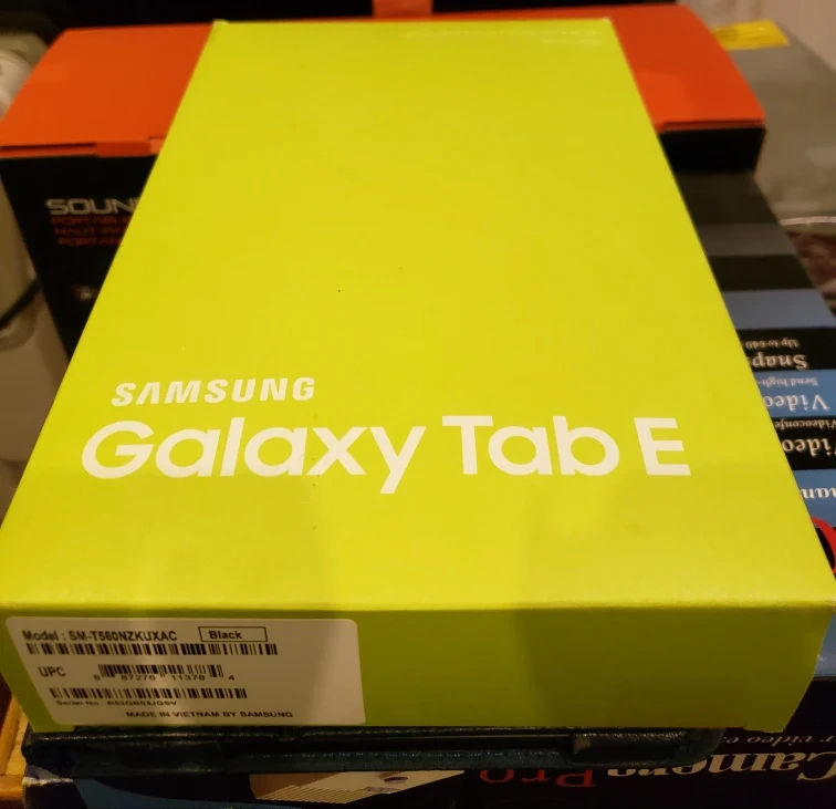 Great condition. No scratches. Comes in blue folio case and original Samsung Galaxy Tab E box.