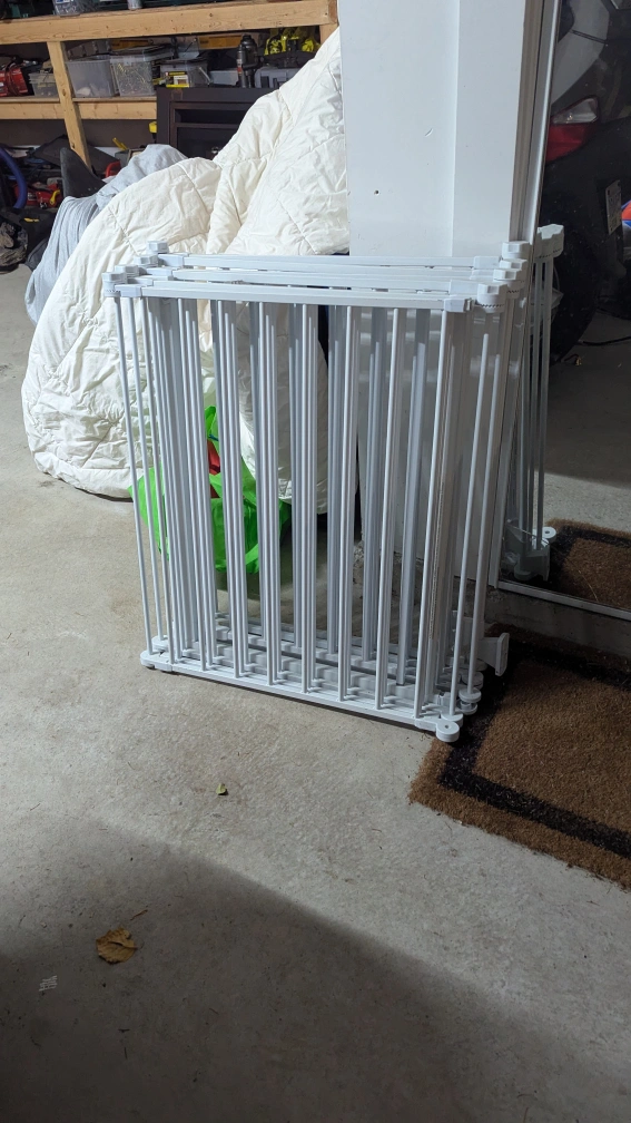 Metal baby gate with a white finish. Folds for easy storage. No hardware required for installation. Great for doorways, hallways, or stairs.