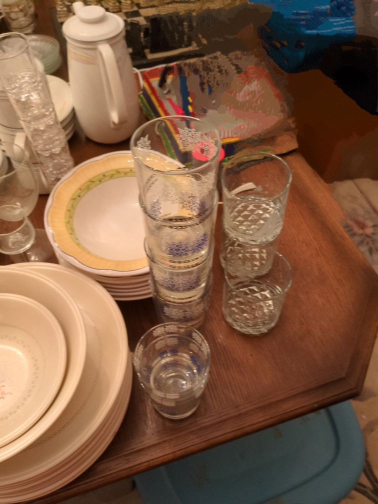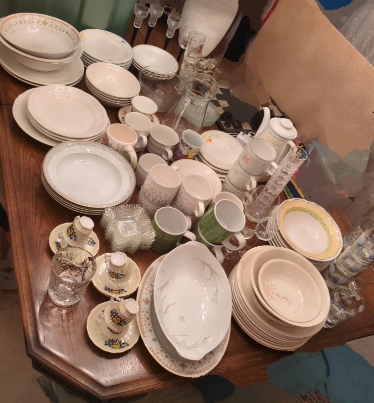 Large set of dinnerware and glassware. Includes plates, bowls, mugs, glasses, and a teapot. Some pieces have floral designs. some are Mikasa. pick up at Markham. or best offer