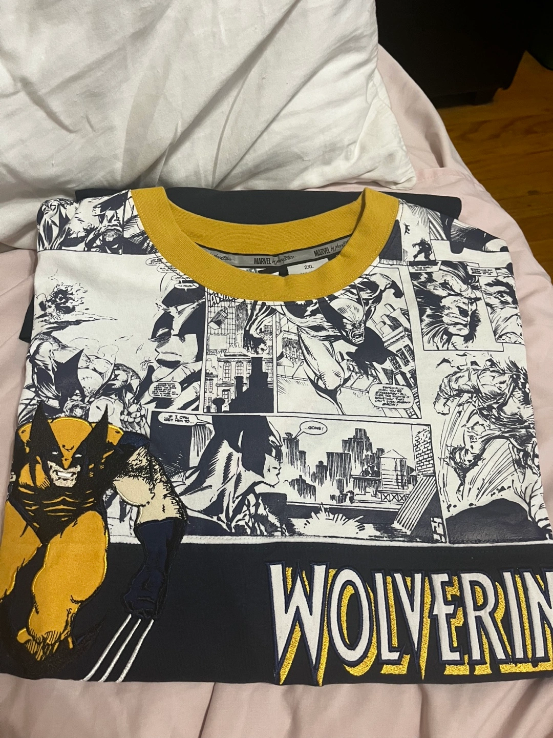 Size 2XL, 100% cotton, black, yellow, and white comic book print, Wolverine character image, short sleeves, crew neck