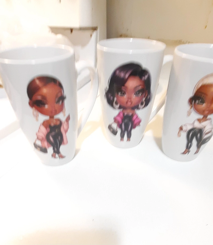 Set of 3 white mugs with black women designs. Each mug has a different design.