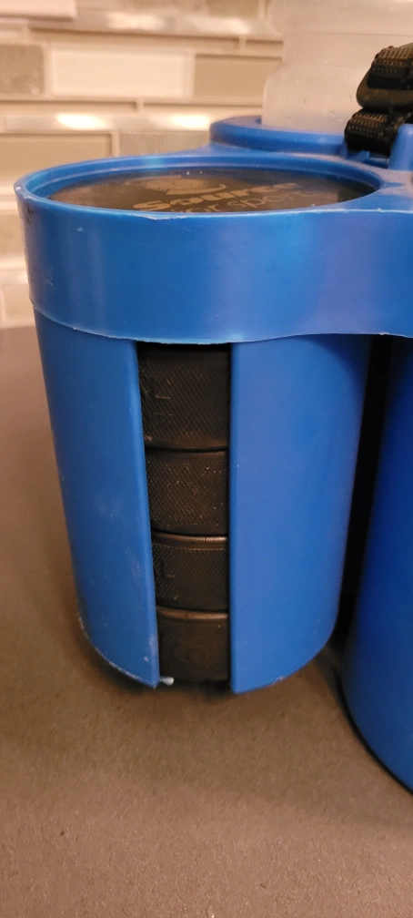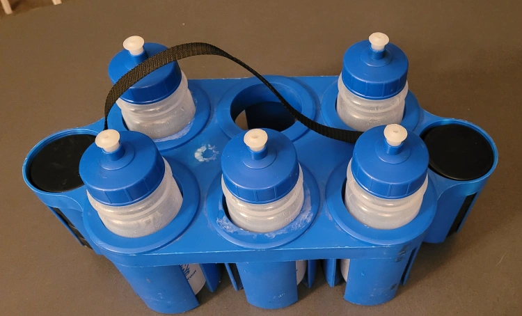 Water bottle carrier holds 6 bottles and 10 pucks. Blue with black strap. No cracks in case. missing one original bottle. Strap is in excellent shape and adjustable. Some marks from wear. 5 bottles and 10 pucks included.