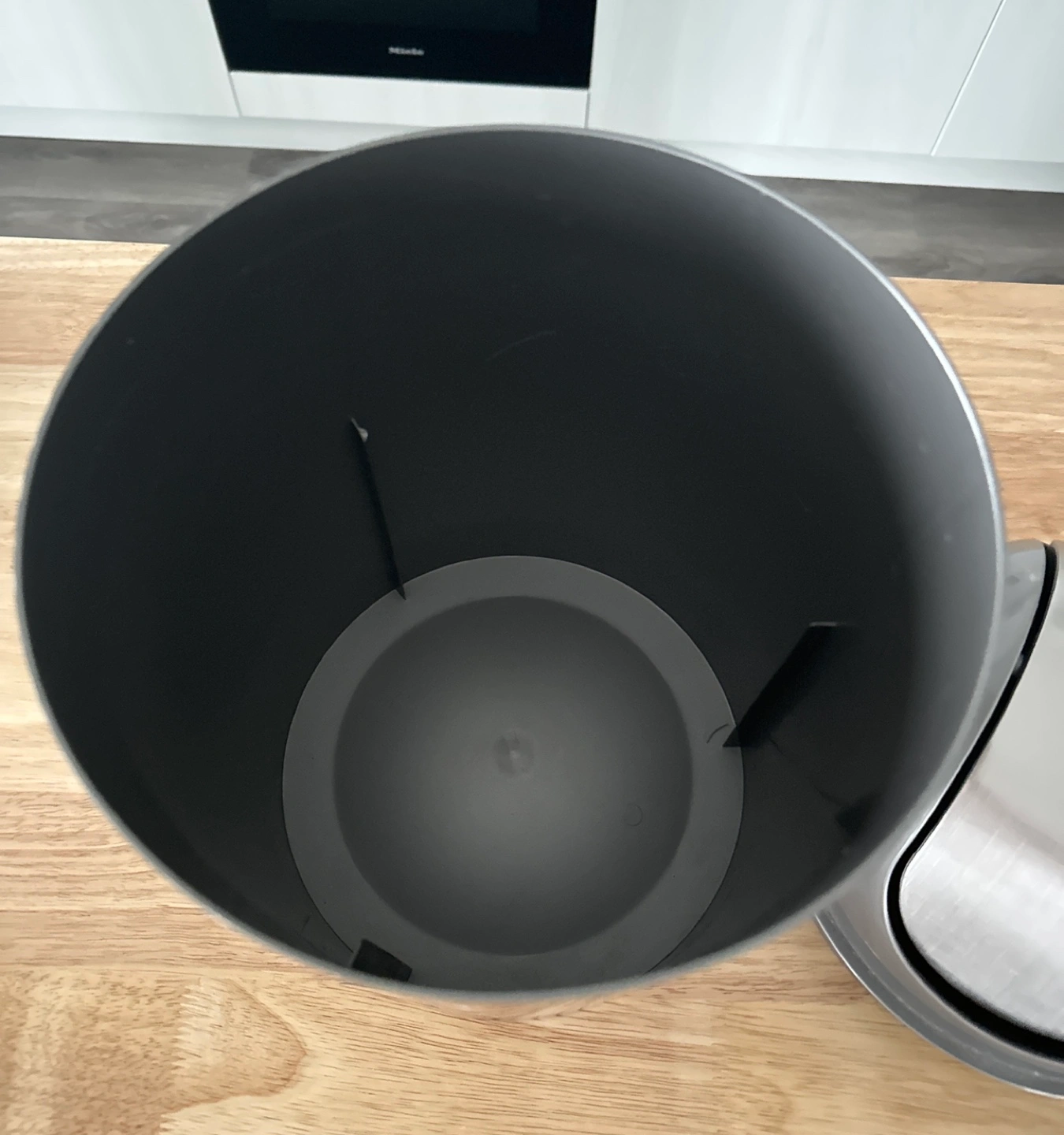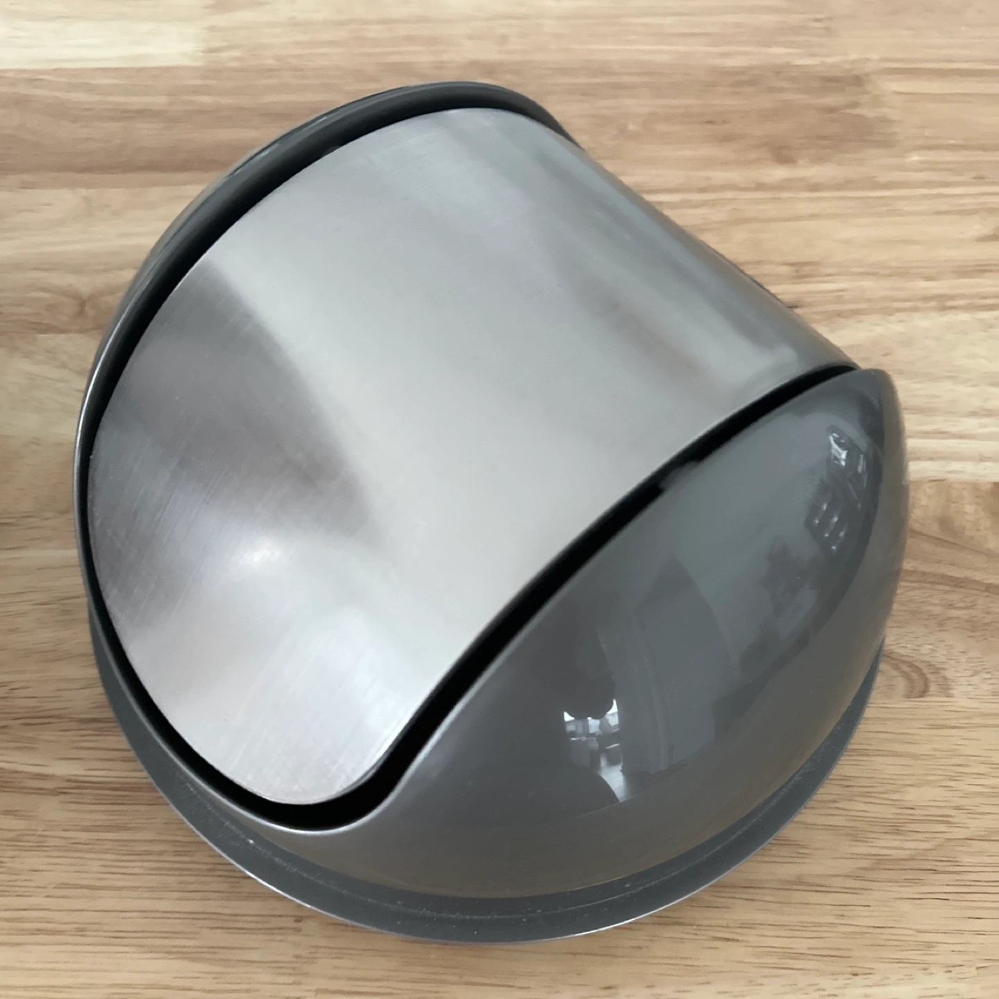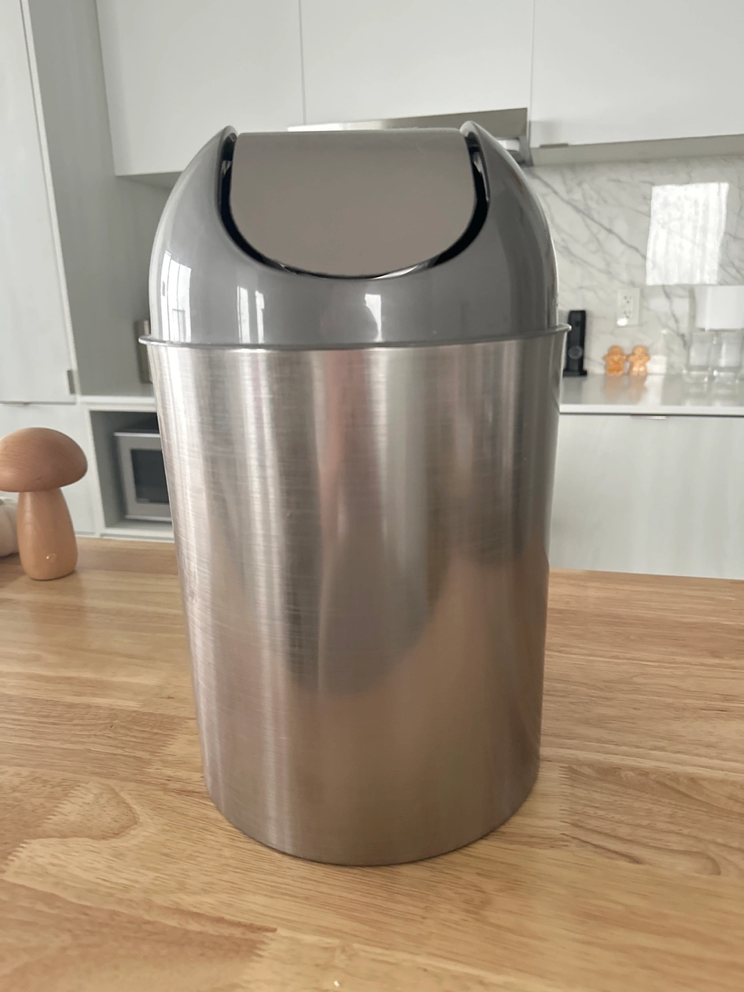 Small stainless steel trash can with grey lid and a swing top. Never used it as it doesn’t fit my decor.
