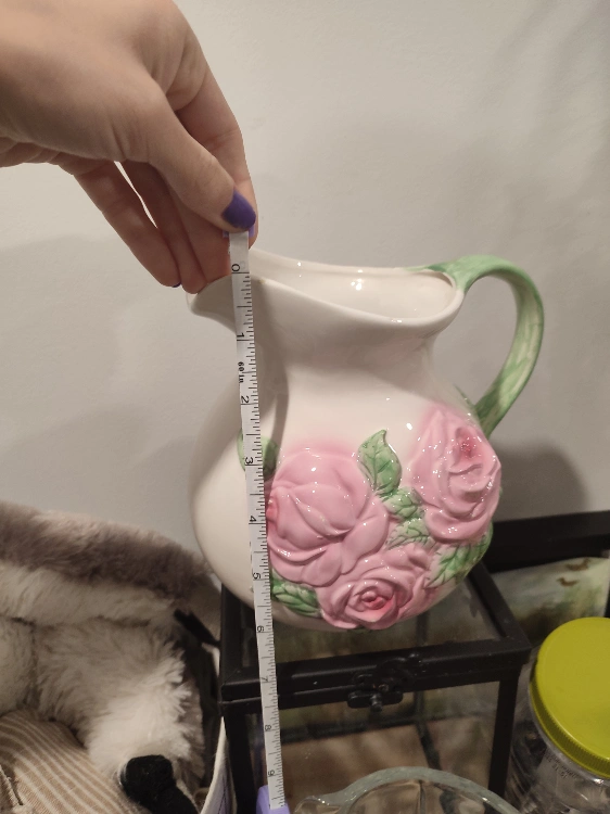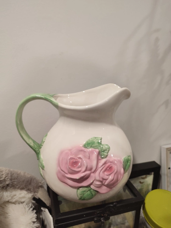 Beautiful ceramic picher with pink flowers, can be used for lemonade, or other drinks. Small unnoticeable chips on some of the flowers.