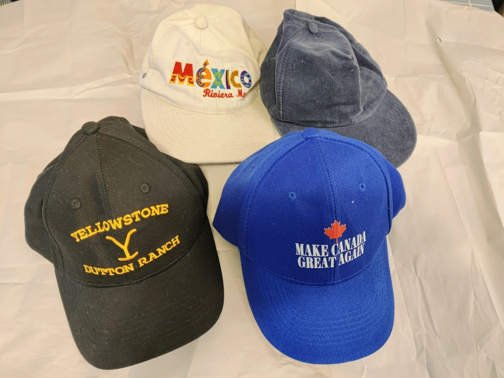 Four baseball caps with various designs. Includes a white cap with a colourful Mexico logo, a blue cap with a Make Canada Great Again slogan, a black cap with a Yellowstone Dutton Ranch logo, and a dark blue corduroy cap.
