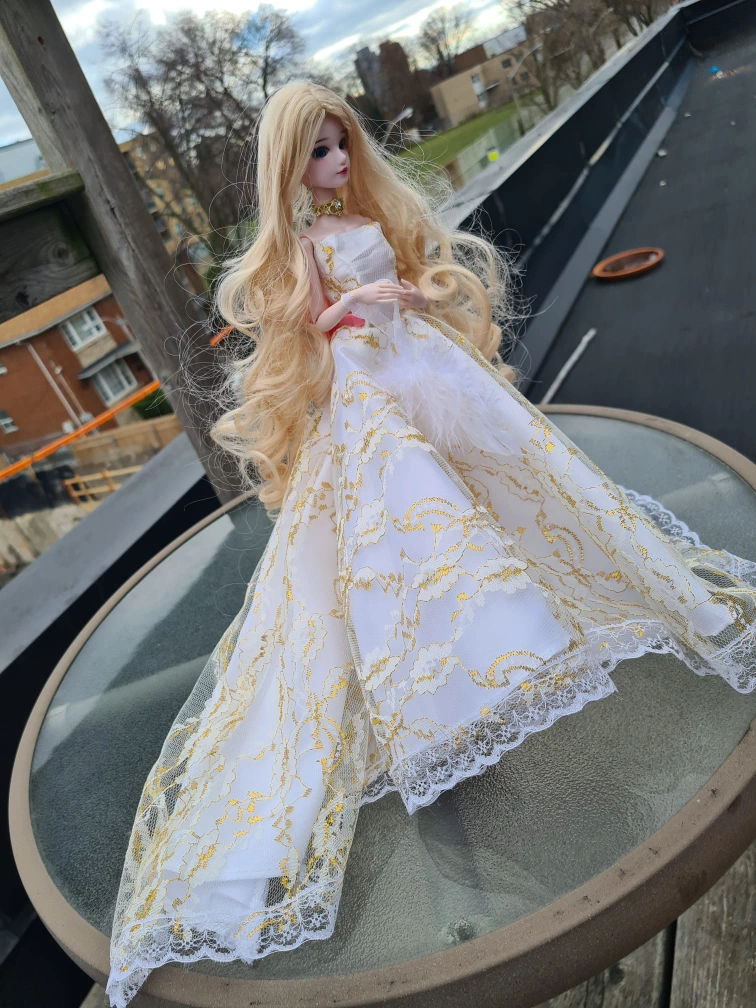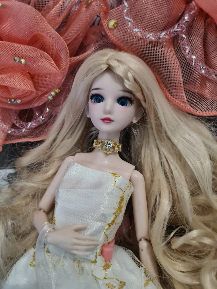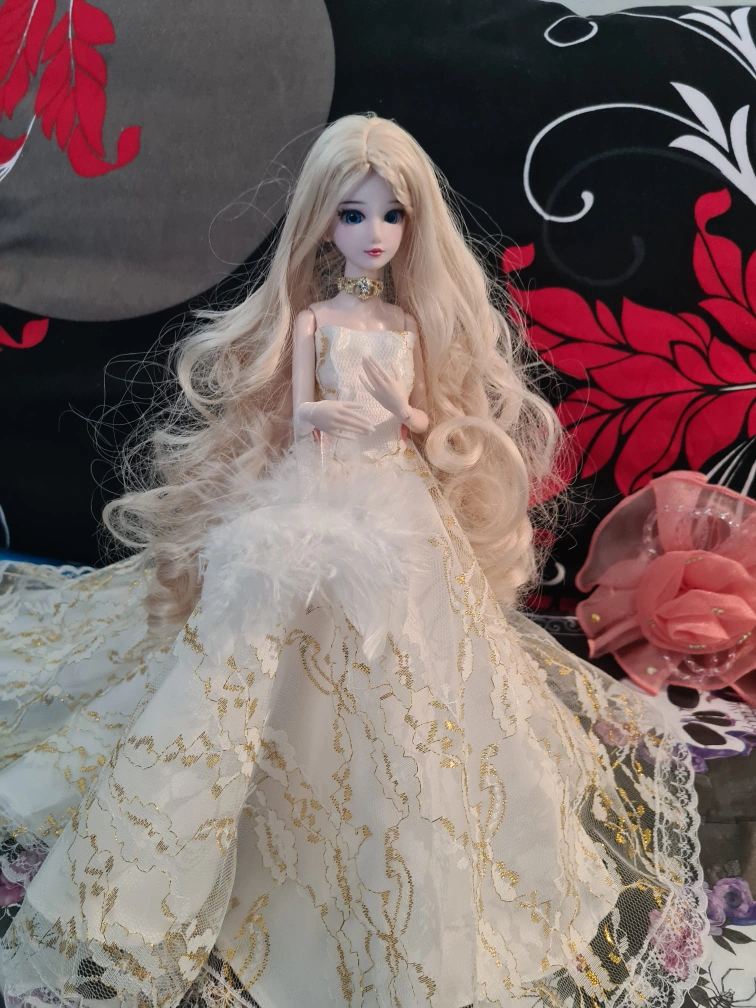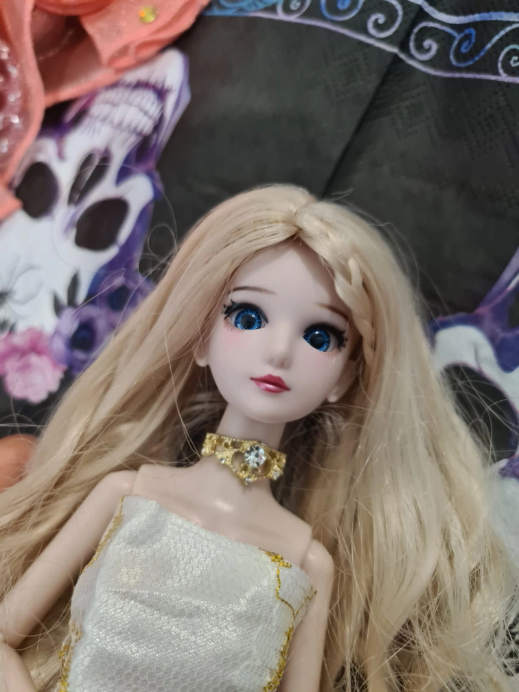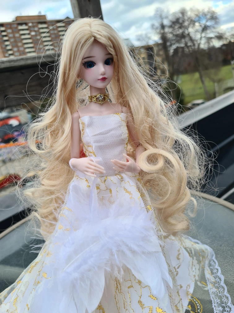 She is the most beautiful BJD I have in my collection. She is 1/6 BJD. A gorgeous face Sculpt, has beautiful blue eyes and blonde hair. She is very slim and is size wise similar to a barbie doll (30cm).