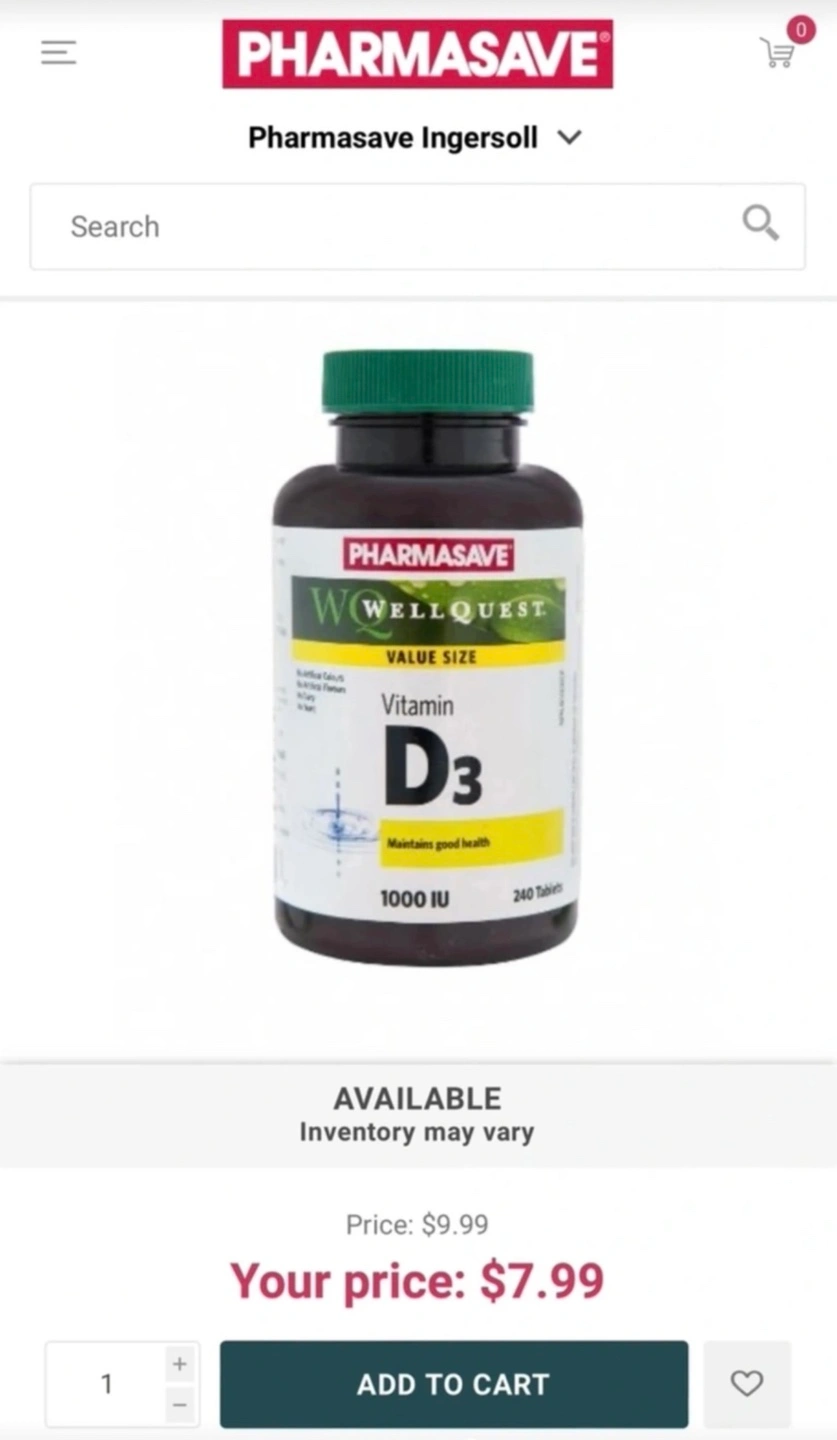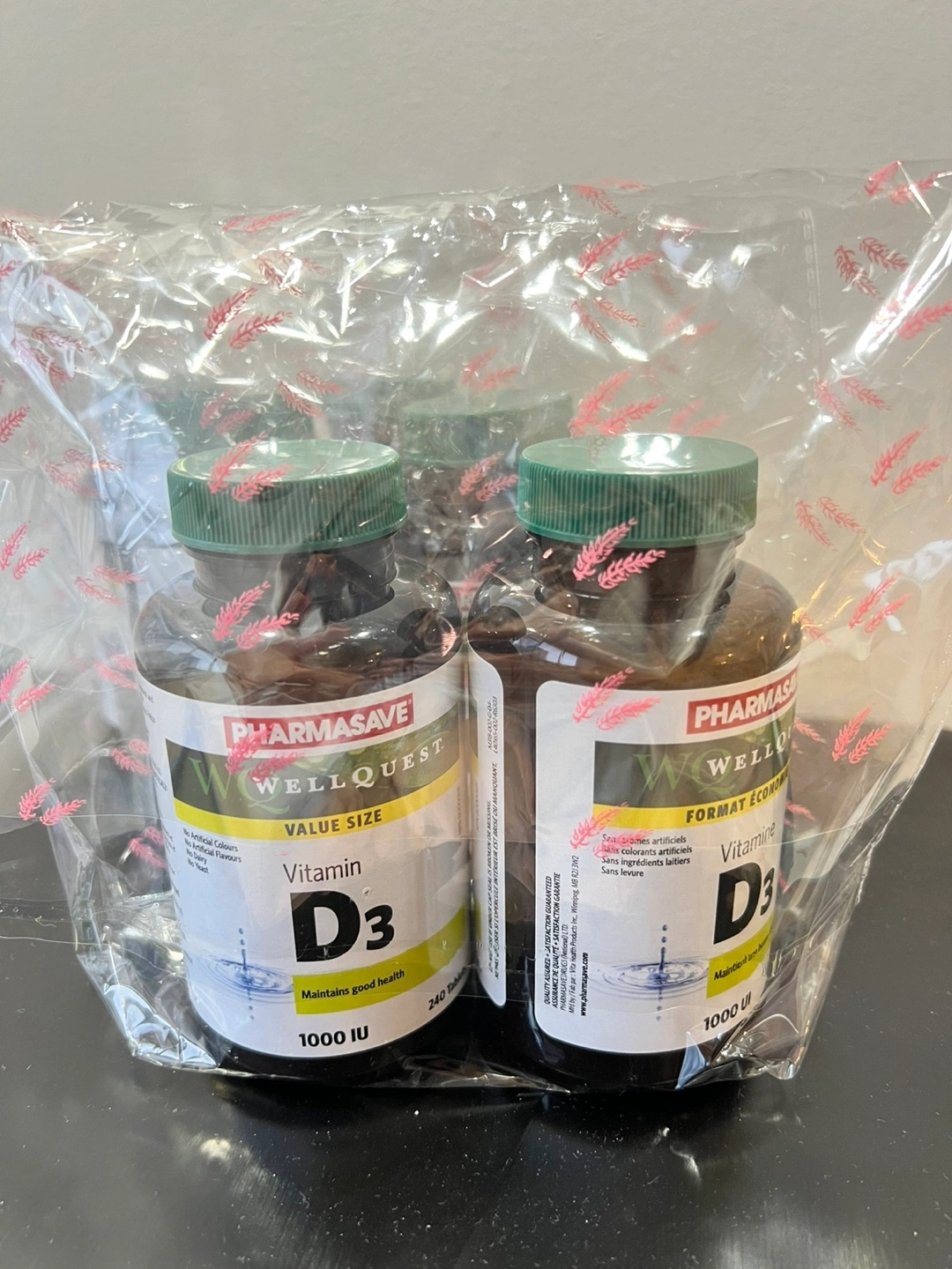 4076 bottles of Pharmasave Wellquest Vitamin D3 1000 IU 240 tablets. Maintains good health. The original price is $7.99 per bottle.