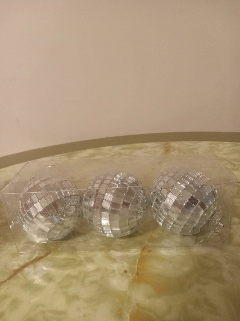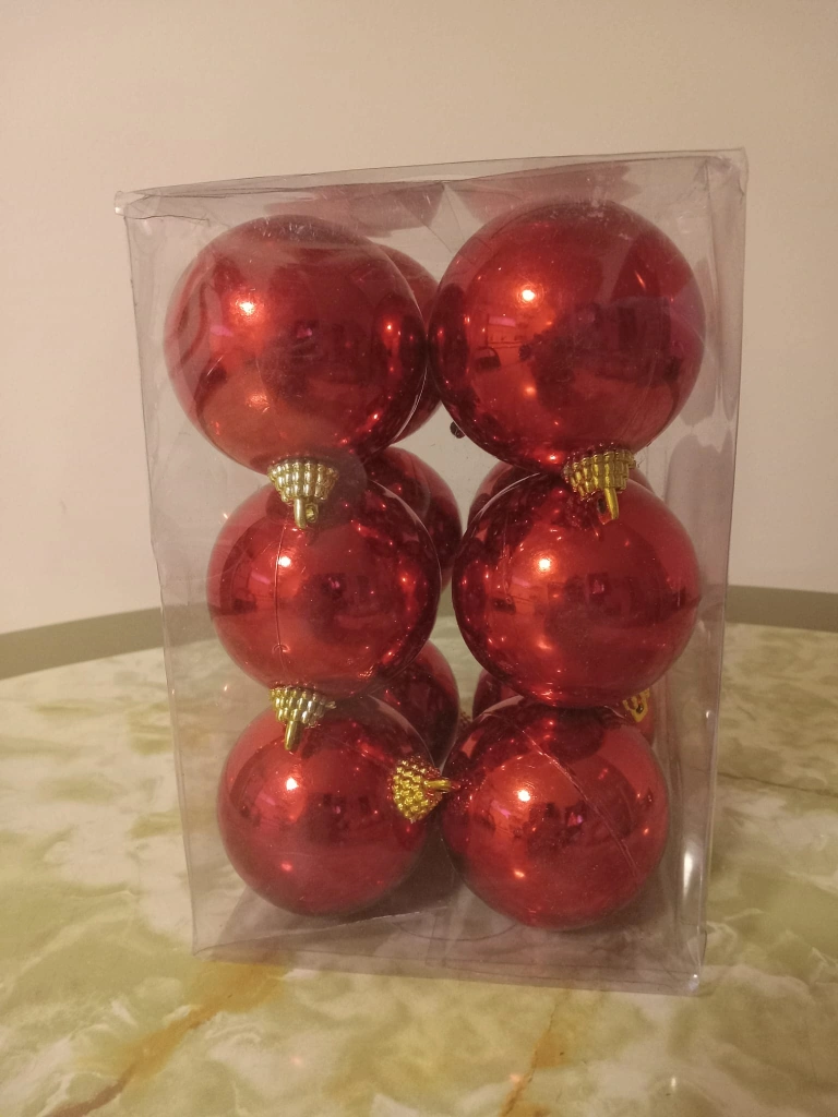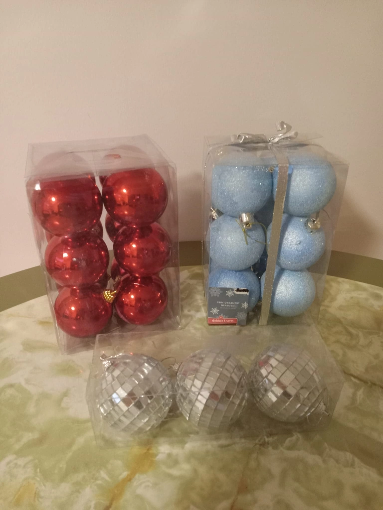 Set of 12 blue glitter Christmas ornaments $10. New, never opened. 3 mirrored ornaments or 12 red plastic ornaments $6 each package.