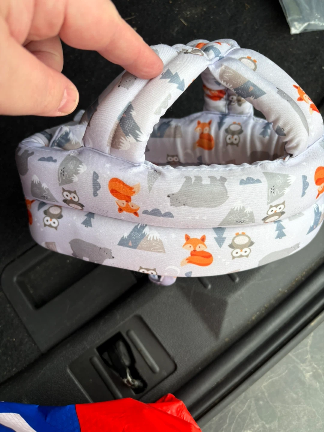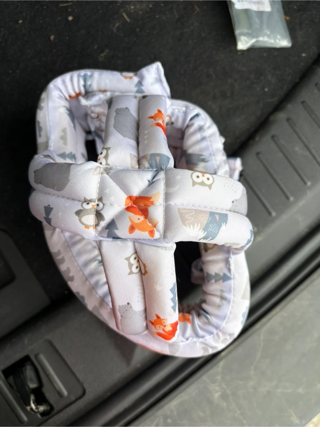 This adorable baby head protection helmet features a cute woodland animal print with foxes, owls, and bears. It's designed to offer soft cushioning and support for little ones exploring their world. Padded straps provide a comfortable and secure fit.