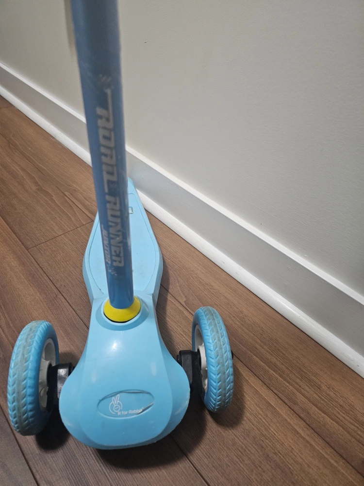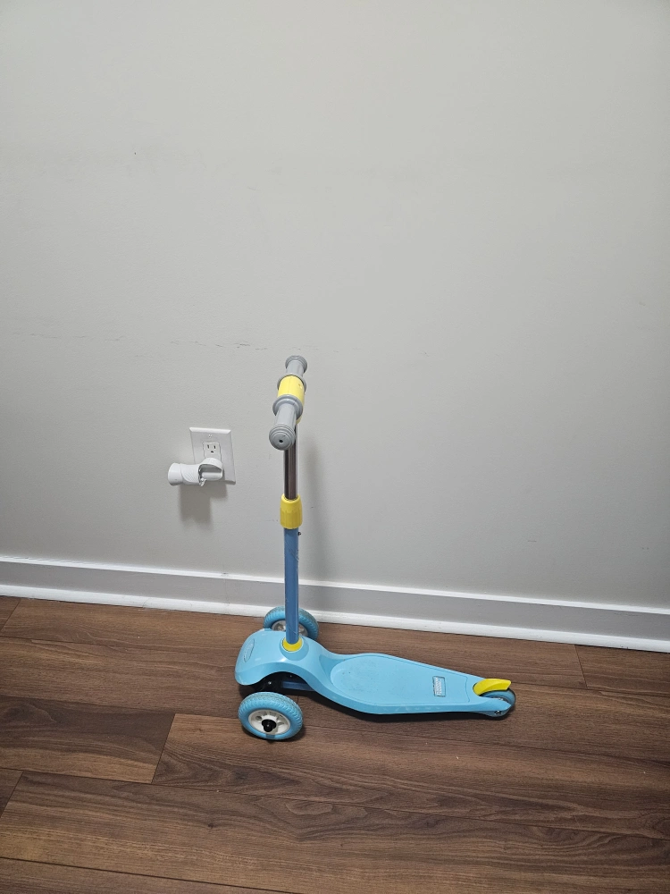 Blue kids' scooter with yellow accents/brake. Has 2 wheels. Has a height-adjustable handle. In good condition.
