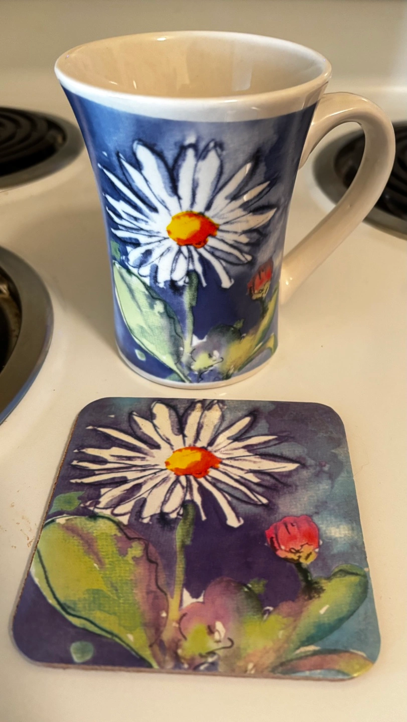 Mug and coaster set with a daisy design. The mug is a tall, thin design comes with cork coaster