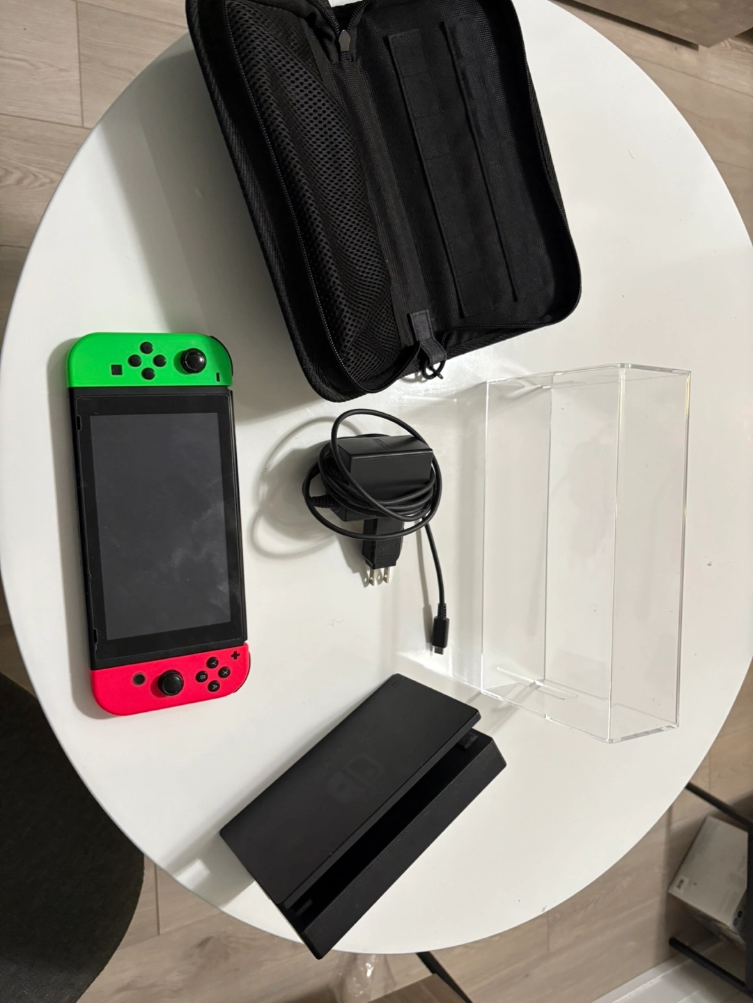 Nintendo Switch console, comes with a case, charging cable, and a stand. The screen has a crack. The Switch is from Europe and requires a converter (included) to charge.