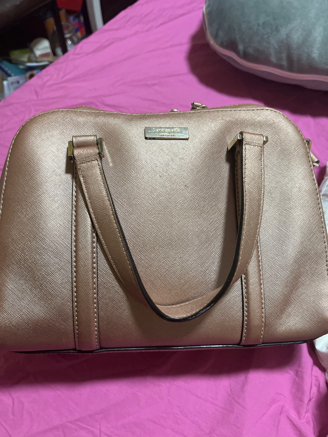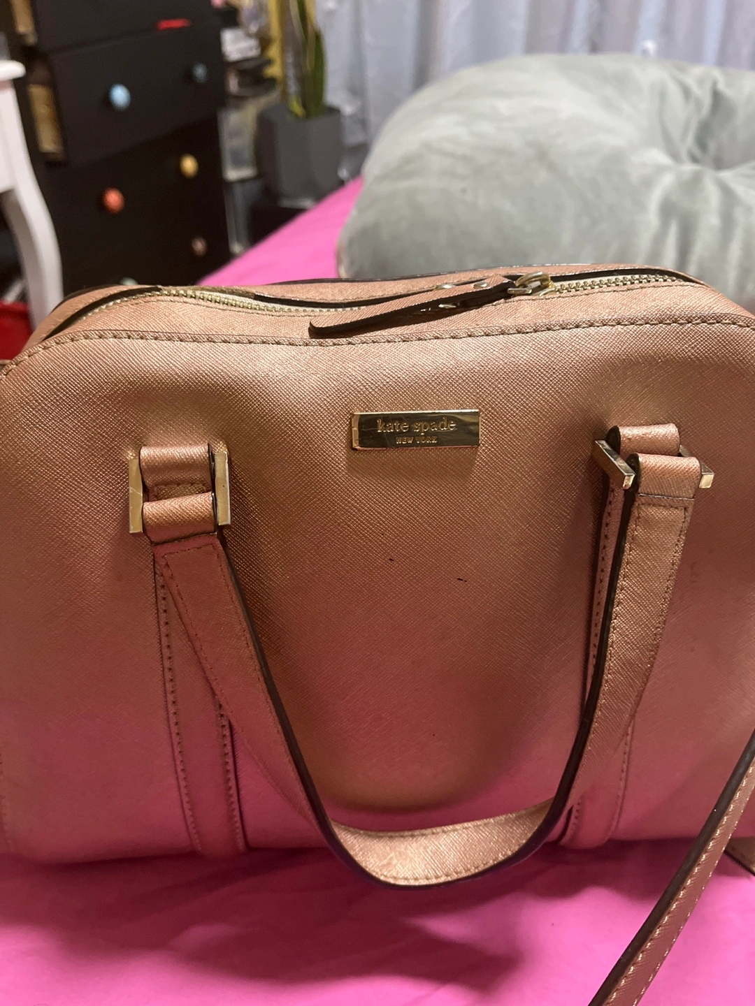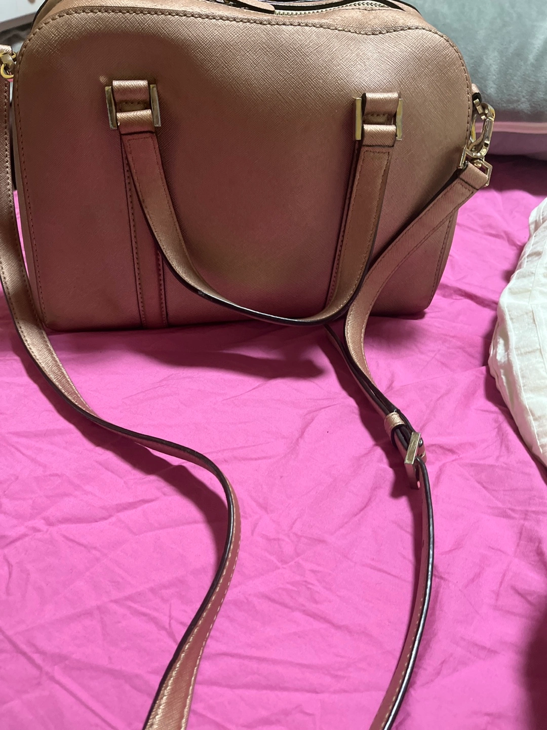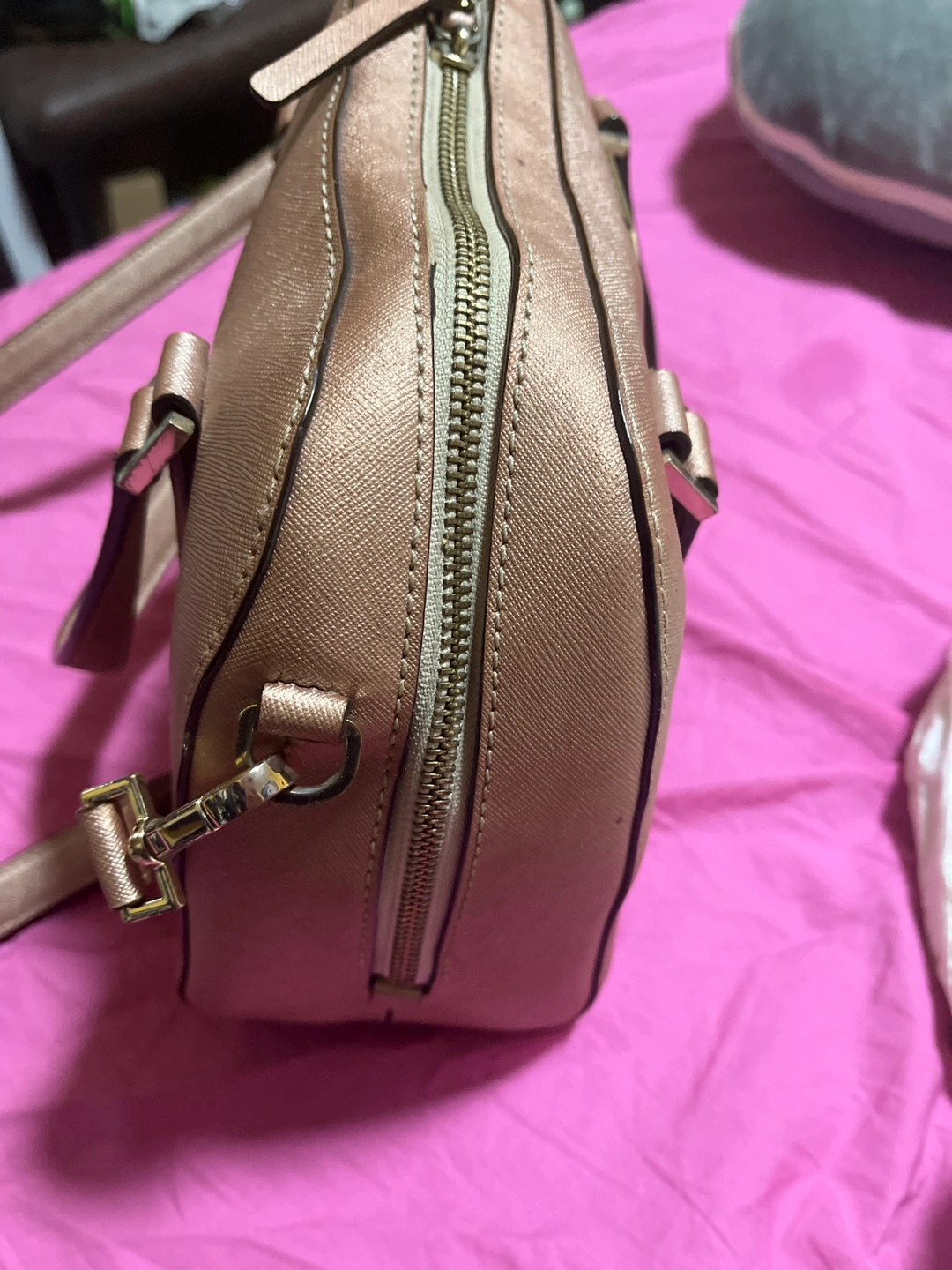 Rose gold satchel style handbag with an adjustable strap. Has two handles, zipper closure, and gold hardware.