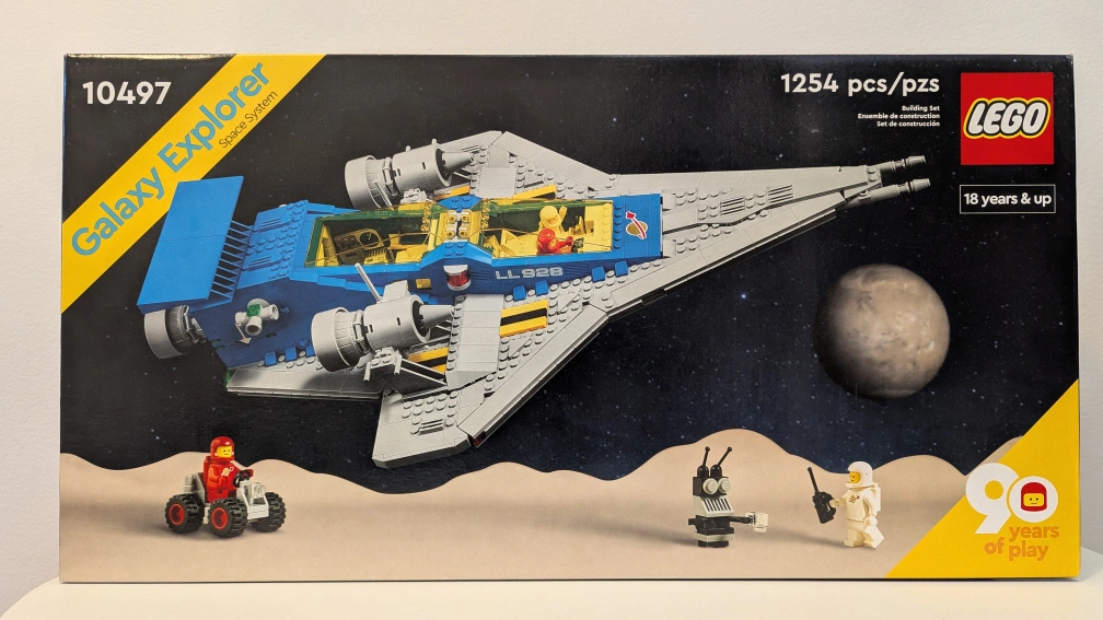 Retired LEGO set 10497 Galaxy Explorer. 1254 pieces. 18 years and up. Comes with astronauts, a rover, and a robot.