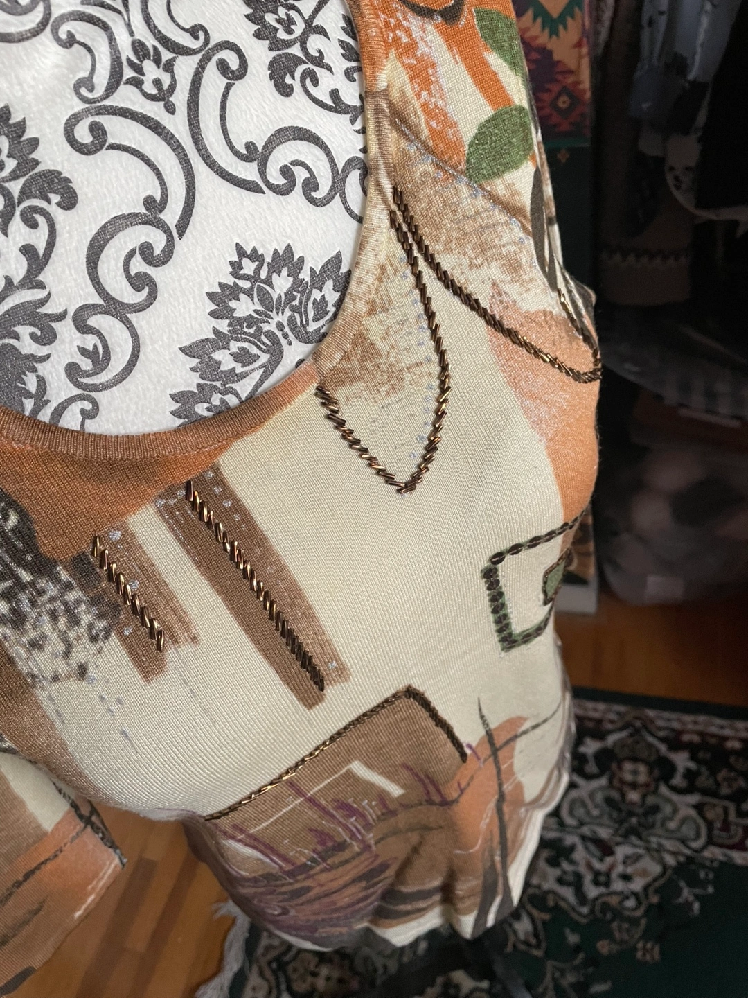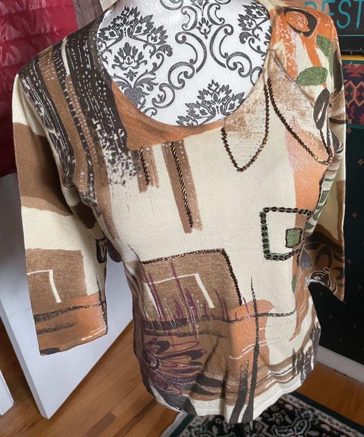 Fine knit Beige coloured three quarter sleeve top with an abstract print and metallic accents. Made of 69% Viscose and 31% Polyamide. Pick up Victoria park ave north Lawrence Ave Side street Clintwood gate