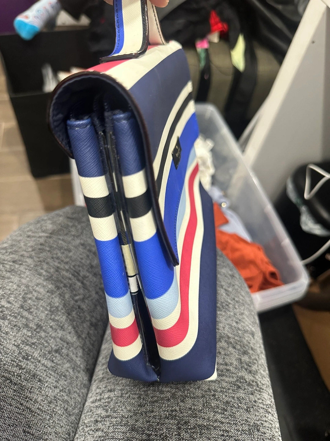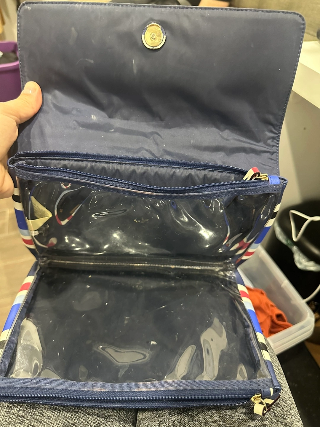 Striped cosmetic bag with clear compartments, zipper closures, and a top handle.