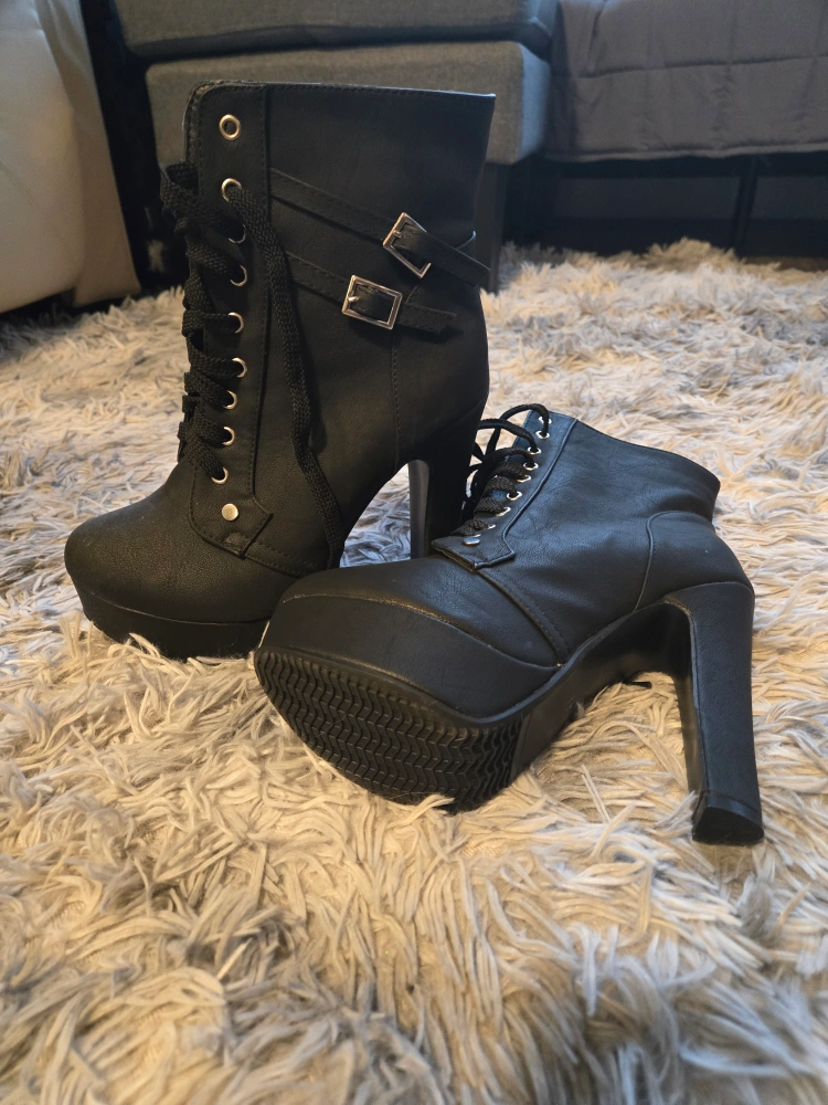 Black platform booties with buckle detail. Lace up. High heel. Never worn. I use a walker or cane. It was just a dream π