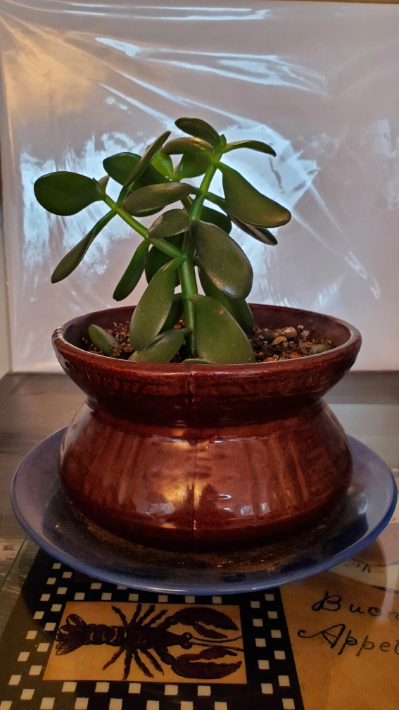 Small jade plant in a brown ceramic pot. The plant is healthy and has several stems and leaves.