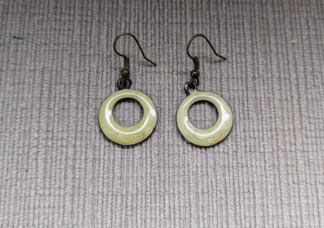 592Round, cream-coloured earrings with a bronze finish. The earrings are in excellent condition and have not been worn.